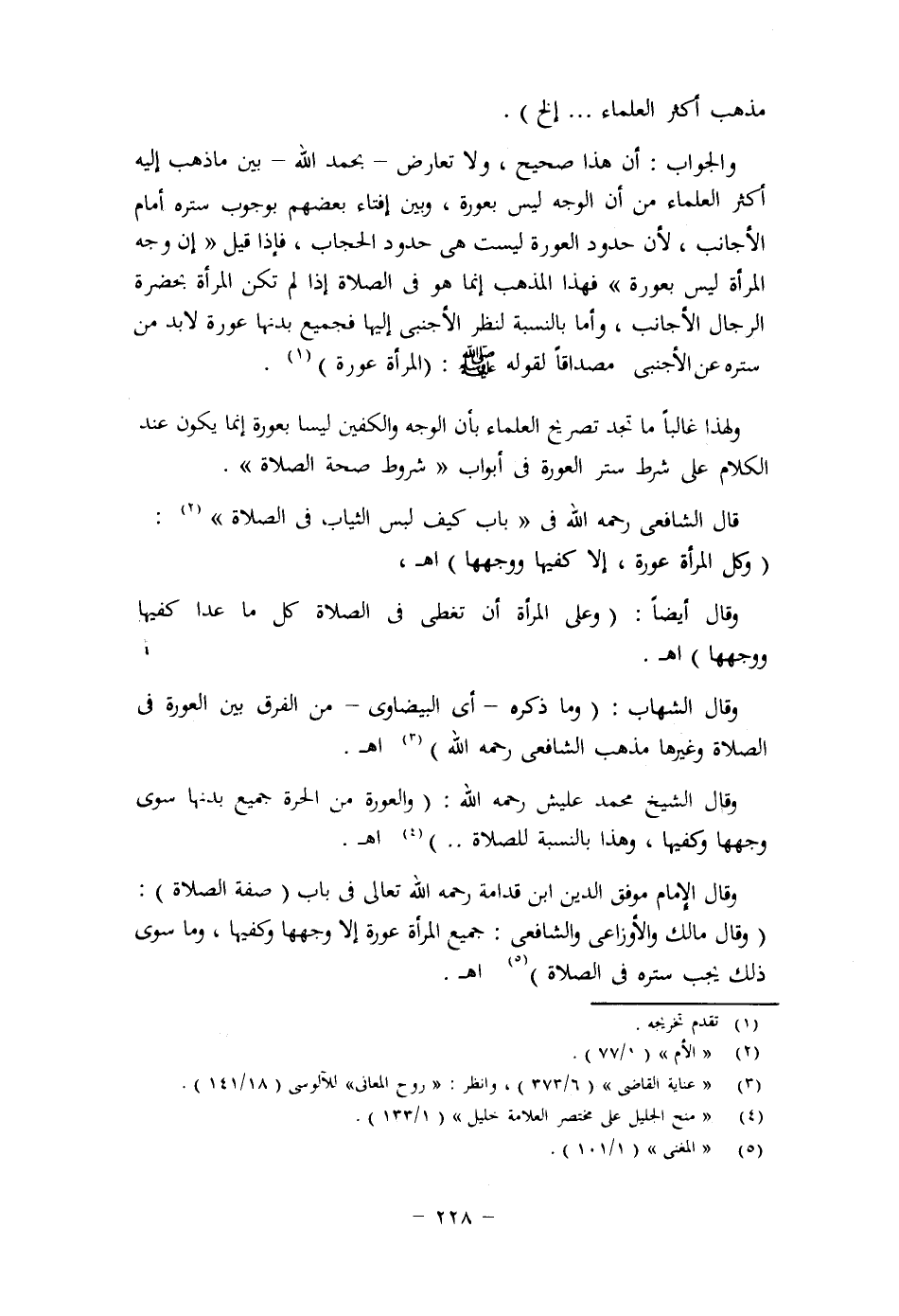 من غير أن يشمل الوجه والكفين لكان كلامه تعالى عبثا في حق أمهات المؤمنين إذ من العجائب أن يؤمر أولًا بالتستر الكامل حتى الوجه والكفين، ثم يؤمر بتغطية الرأس فقط، مع بقاء الآية الأولى محكمة غير منسوخة.