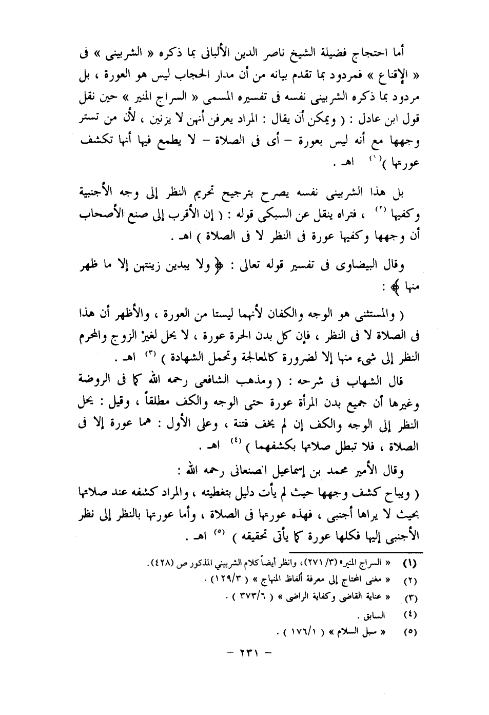 فالصحيح أن مفسدة واحدة صغيرة - وهي التعرض للنساء في الطرقات - لما ظهرت واقتضت أمرًا من أوامر الله يسد به بابها أمر الله بأمر يكفي لسد باب هذه المفسدة، ولسد أبواب المفاسد الأخرى التي هي أكبر من أختها، فأمر بستر الرأس والوجه حتى ينقطع السبيل.
