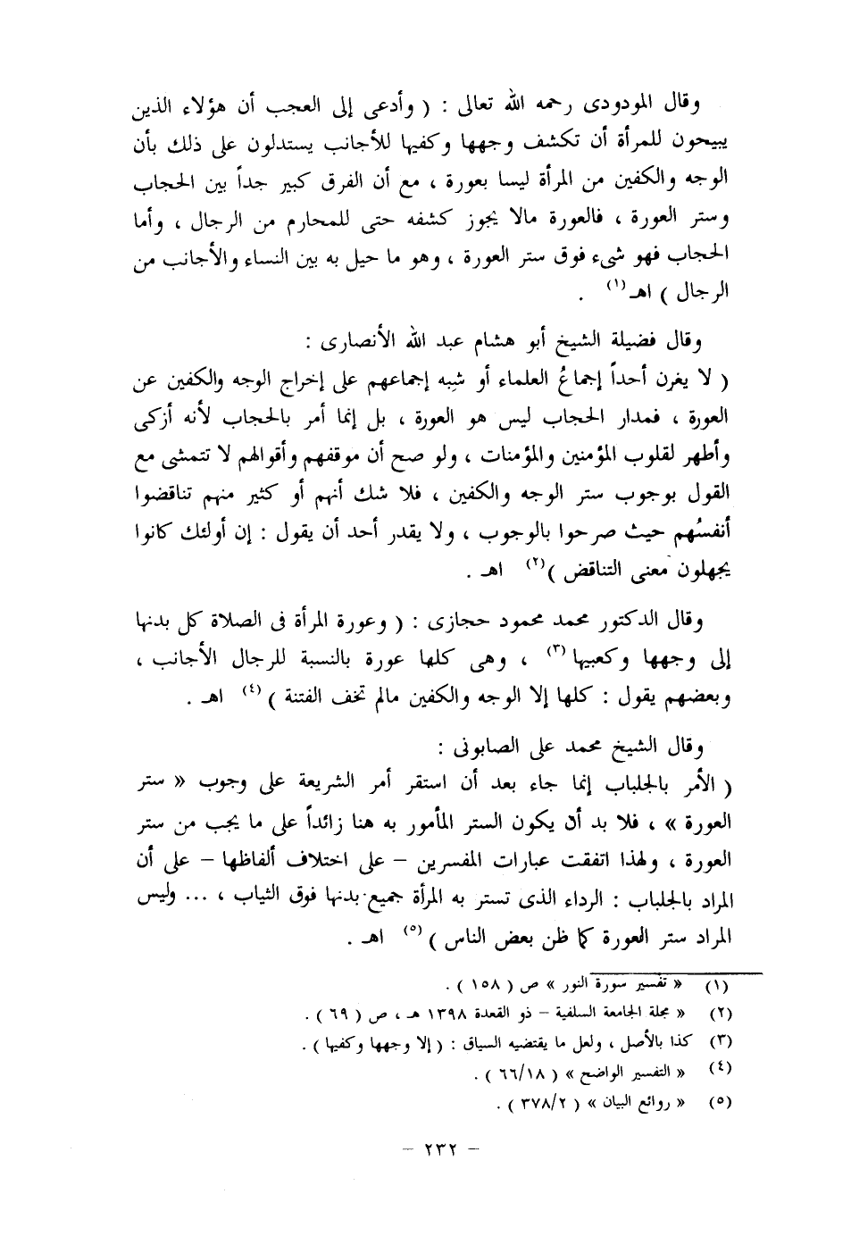ثم قال حفظه الله معقبًا: هذه هي أقوال أعلام هذه الأمة من لدن أفضل القرون إلى القرن الرابع عشر الذي نعيش فيه، يعرف منها أن من تصدى لتفسير إدناء الجلباب فقد فسره بتغطية الوجه، ولو كان ممن يقول بجواز كشفه، ولا يُعْرَف أحد خالف هذا التفسير صريحا، وإنما يستأنس بأقوال بعضهم أنه لا يرى تغطية الوجه جزءًا من إدناء الجلباب، وهاك نصوص هولاء: