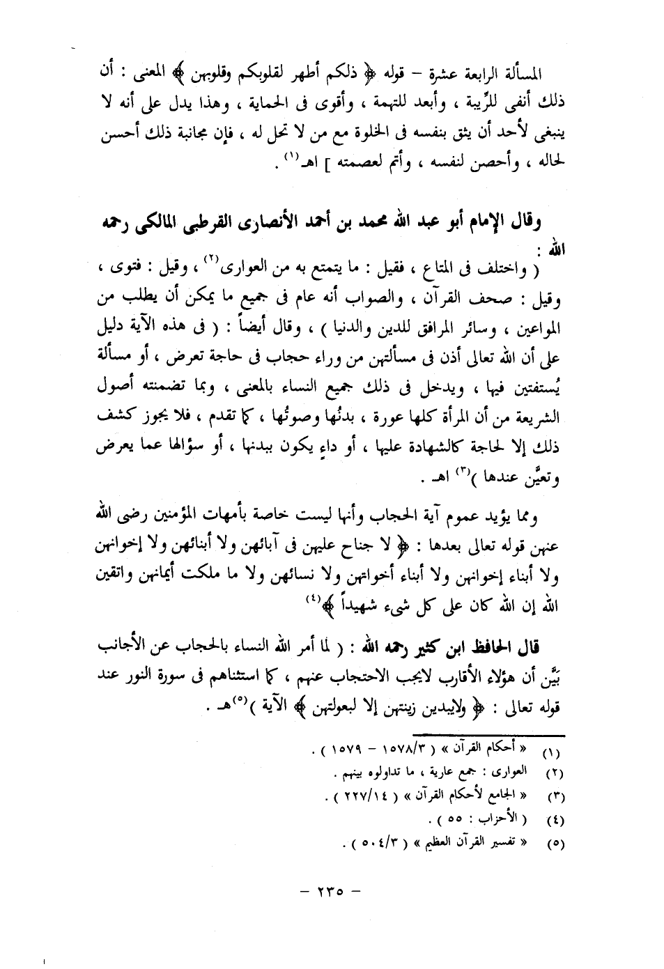 نعم، هذه الآية يفسرها قوله تعالى: (وَإِذَا سَأَلْتُمُوهُنَّ مَتَاعًا فَاسْأَلُوهُنَّ مِنْ وَرَاءِ حِجَابٍ) ، وقوله تعالى: (وَلَا يُبْدِينَ زِينَتَهُنَّ إِلَّا مَا ظَهَرَ مِنْهَا) ، وأما تفسيرها بقوله تعالى: (وَلْيَضْرِبْنَ بِخُمُرِهِنَّ عَلَى جُيُوبِهِنَّ) فتفسير لجزء من مدلولها، ولناحية من نواحي معناهِا الواسعة الأرجاء، فلا يصح الاقتصار عليه، وقد قدمنا ما في الاستدلال بهذه الآية على جواز كشف الوجه (1) ، فلا حاجة إلى الإعادة.