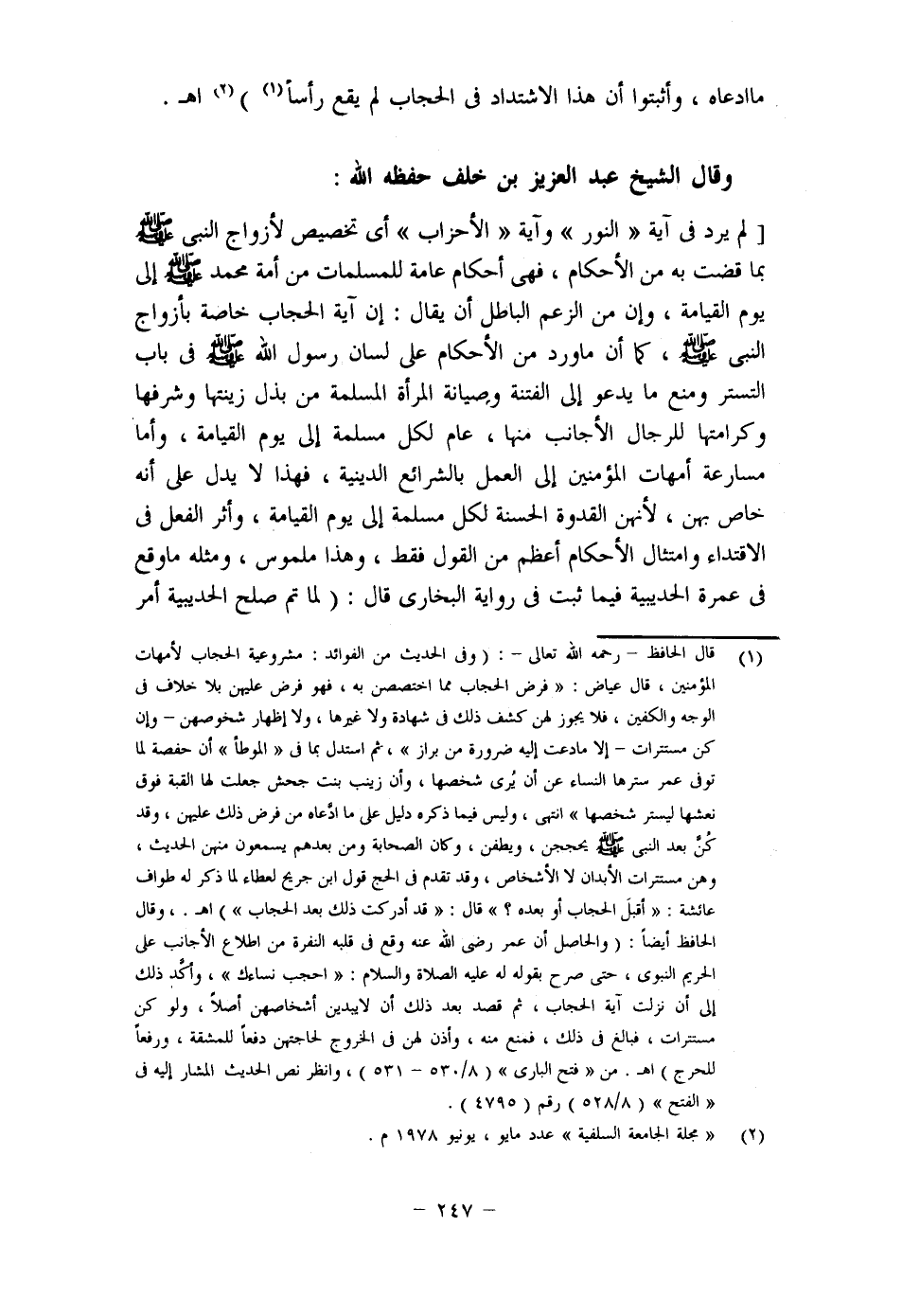 وقال أيضًا: (فليست العورة في الصلاة مرتبطة بعورة النظر لا طردا