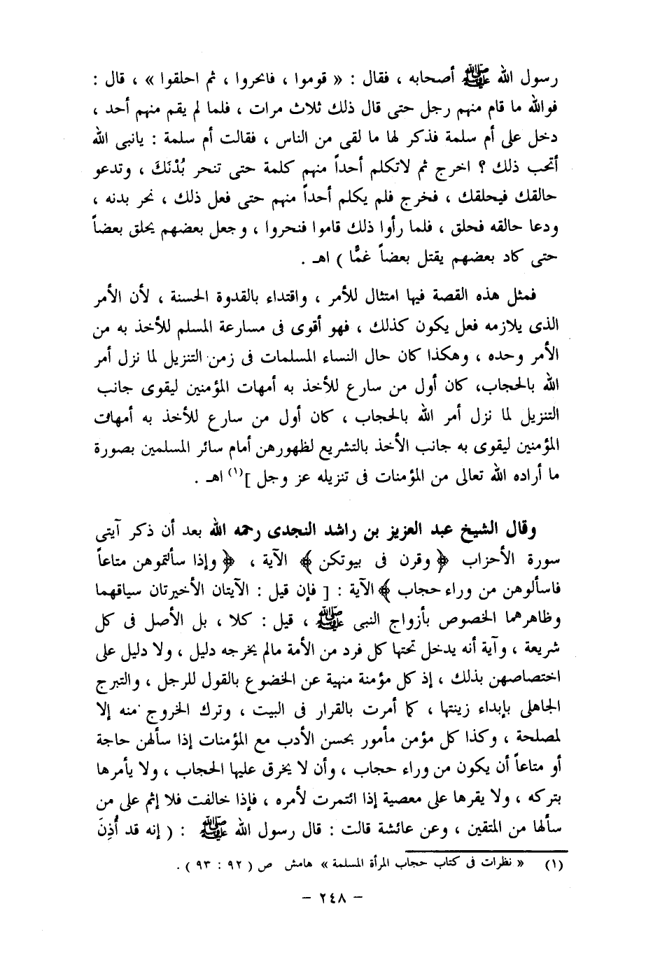 أما احتجاج فضيلة الشيخ ناصر الدين الألباني بما ذكره "الشربيني" في "الإِقناع" فمردود بما تقدم بيانه من أن مدار الحجاب ليس هو العورة، بل مردود بما ذكره الشربيني نفسه في تفسيره المسمى "السراج المنير" حين نقل قول ابن عادل: (ويمكن أن يقال: المراد يعرفن أنهن لا يزنين، لأن تستر وجهها مع أنه ليس بعورة- أي: في الصلاة - لا يطمع فيها أنها تكشف عورتها) (3) اهـ.