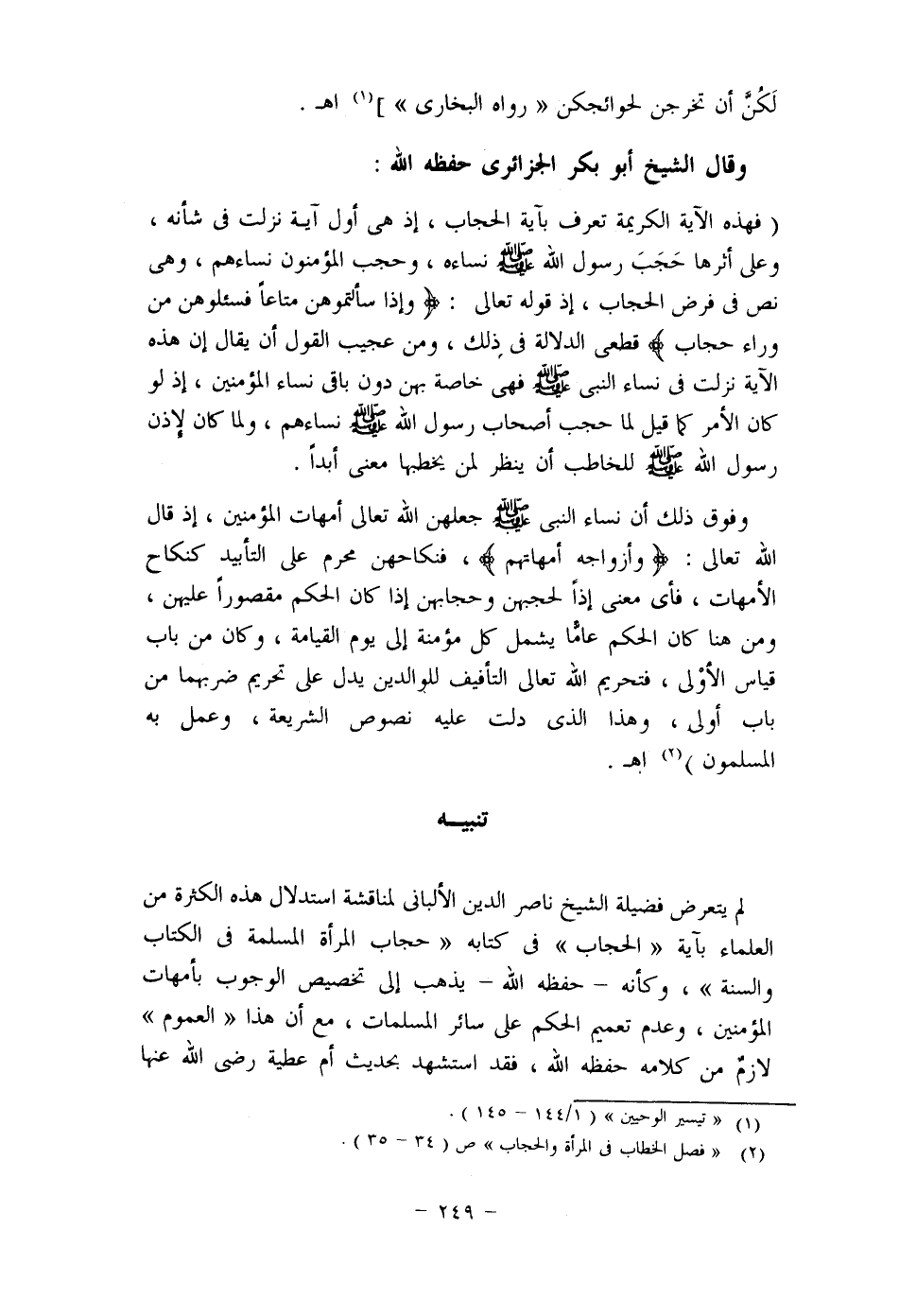 فمدار الحجاب ليس هو العورة، بل إنما أمر بالحجاب لأنه أزكى وأطهر لقلوب المؤمنين والمؤمنات، ولو صح أن موقفهم وأقوالهم لا تتمشى مع القول بوجوب ستر الوجه والكفين، فلا شك أنهم أو كثير منهم تناقضوا أنفسُهم حيث صرحوا بالوجوب، ولا يقدر أحد أن يقول: إن أولئك كانوا يجهلون معنى التناقض) (4) اهـ.