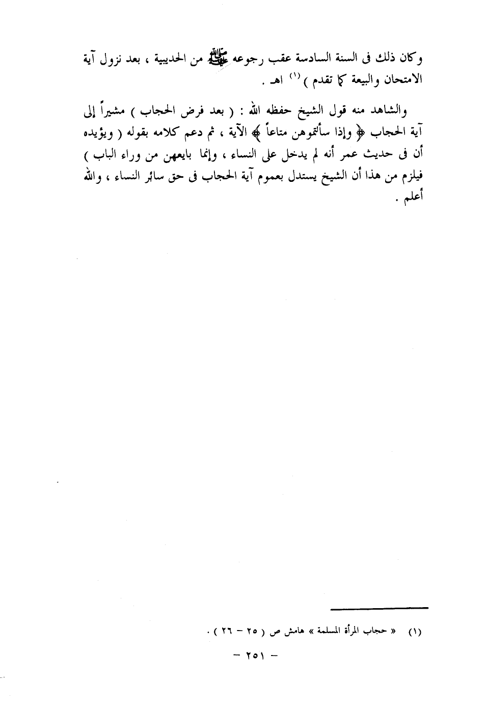 وهذا المعنى هو الذي يشهد له عمل أمهات المؤمنين، ولم يختلف العلماء في تعيين هذا المعنى حتى نطيل الكلام في تحقيقه، وإنما يقول من يظن أن الوجه والكفين خارجان عن الحجاب: "إن هذه الآية مختصة بأمهات المؤمنين"، وهذه الناحية هي التي تقتضي البحث والتنقيب في هذه الآية. * قال شيخ المفسرين الإمام أبو جعفر محمد بن جرير الطبري رحمه الله تعالى: