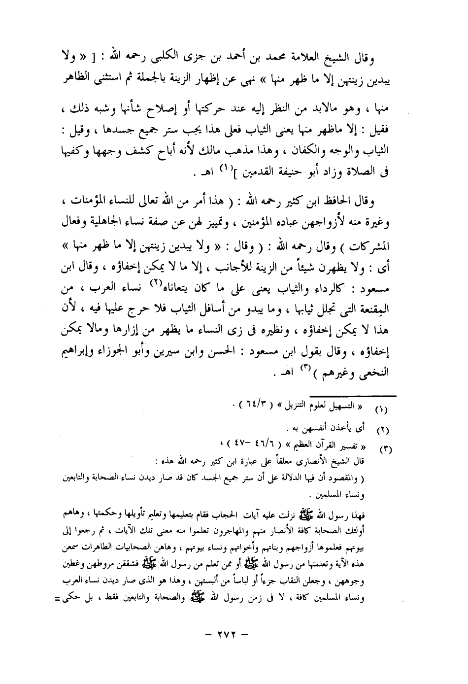 ومحل الشاهد منه قوله تعالى: (وَقَرْنَ فِي بُيُوتِكُنَّ وَلَا تَبَرَّجْنَ تَبَرُّجَ الْجَاهِلِيَّةِ الْأُولَى)