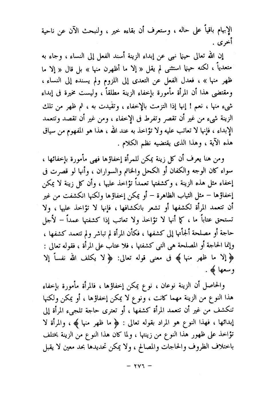 "ومنها: (وَقَرْنَ فِي بُيُوتِكُنَّ ... ) إلخ، والخطاب فيها- وإن كان خاصّا- إلا أن الحكم عام، ثم الخروج عند الحوائج ليس من تبرج الجاهلية الأولى في شيء، إنما تبرجهن أن يخرجن كالرجال بالوقاحة، وعدم تستر" (3) اهـ.