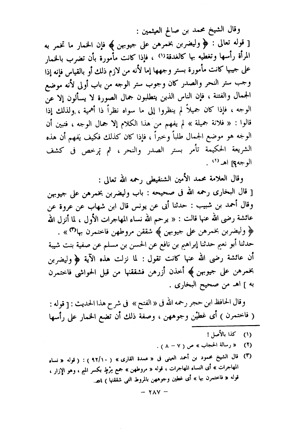 في هذه الحال، وقد صحت الأسانيد إلى ابن عم المصطفى صلى الله عليه وسلم، وإلى غيره من الصحابة رضي الله عنهم عكس هذا المعنى الذي رواه ابن جرير الطبري في "تفسيره" والبيهقي في "سننه" وكذا ابن أبي حاتم في "تفسيره"، وزد على ذلك ما ثبت بأسانيد صحيحة عن رسول الله صلى الله عليه وسلم كما سوف يأتي مفصلا من أمره صلى الله عليه وسلم بالحجاب والستر.