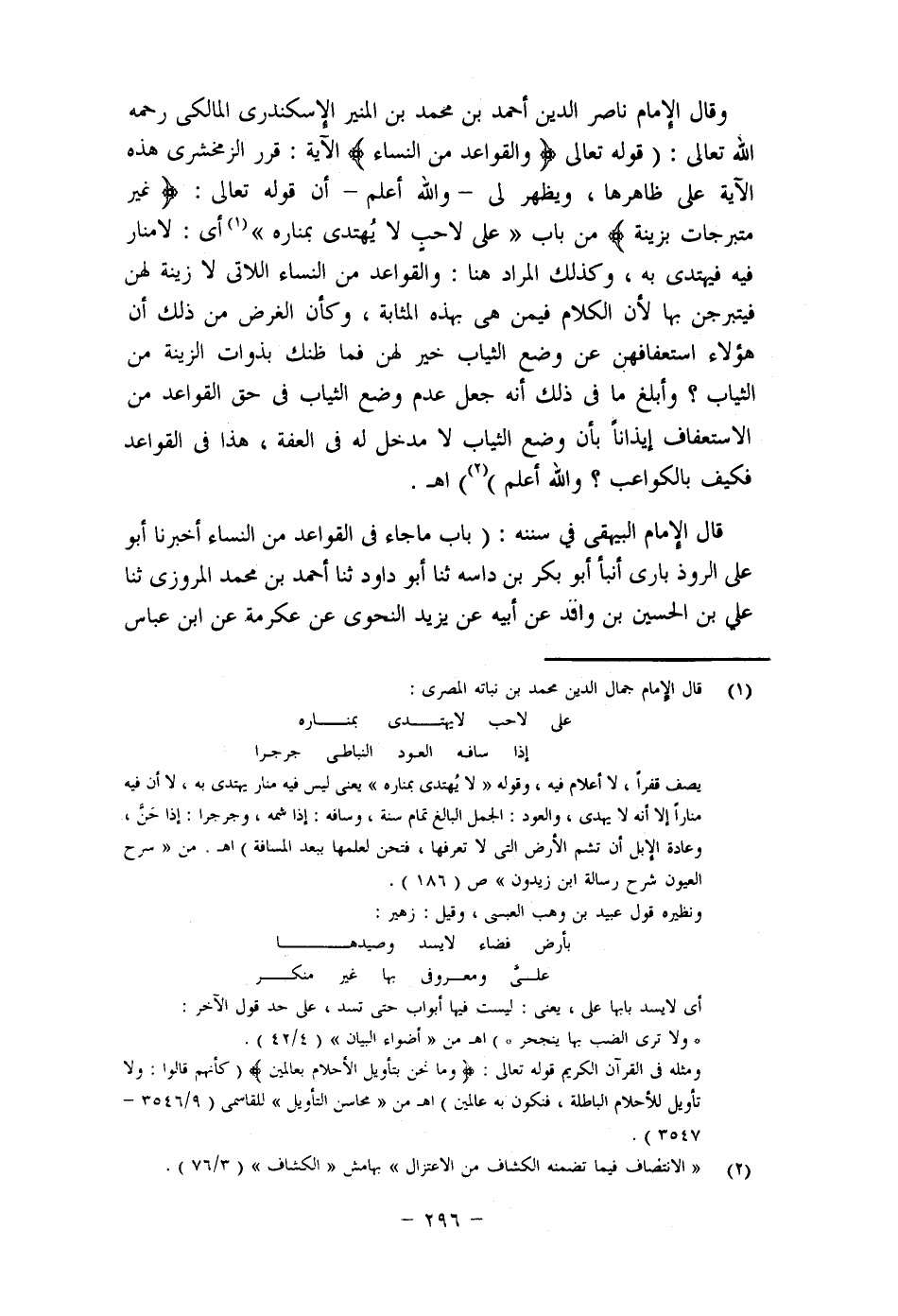 معنى تلك الآيات، ثم رجعوا إلى بيوتهم فعلموهم أزواجهم وبناتهم وأخواتهم ونساء بيوتهم، وهاهن الصحابيات الطاهرات سمعن هذه الآية وتعملنها من رسول الله صلى الله عليه وسلم أو ممن تعلم من رسول الله صلى الله عليه وسلم فشققن مروطهن وغطين وجوههن، وجعلن النقاب جزءًا أو لباسَا من ألبستهن، وهذا هو الذي صار ديدن نساء العرب ونساء المسلمين كافة، لا زمن رسول الله صلى الله عليه وسلم والصحابة والتابعين فقط، بل حكى الشوكاني عن ابن رسلان اتفاق المسلمين على منع النساء أن يخرجن سافرات الوجوه لا سيما عند كثرة الفساق (نيل الأوطار 6/ 245) . ولم يكن فعلهم وفعل نسائهم هذا تطوعَا، ولا التزاما من قبل أنفسهن بما لم يلزمه الله ورسوله، كما يزعمه الله ورسوله، كما يزعمه الزاعمون، بل فعلوا كل ذلك - كما أخبرتنا الصديقة بنت الصديق- إيمانا بكتاب الله وتصديقًا بتنزيله، وامتثالَا بأوامر الله وتناهيًا عن نواهيه، ولم يكن يخفى عليهم أن أوامر الله للوجوب ونواهيه للتحريم، وأن نساءهم بتغطيه وجوههن يمتثلن أمر الحجاب