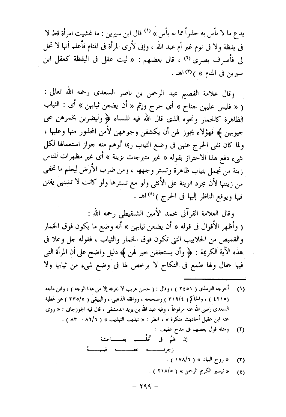 وهذه الآية تأمر المؤمنات بإخفاء الزينة كلها سواء أردنا بالزينة الزينة الخلقية من الوجه والعينين، والأنف والشفتين، والشعر والخدين،