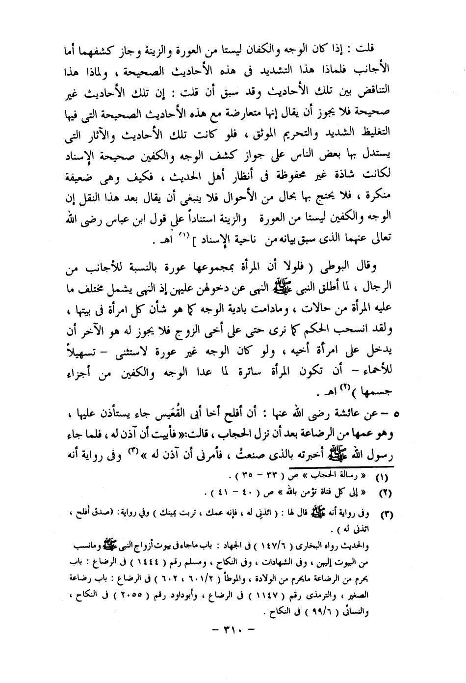 (1) "فصل الخطاب في المرأة والحجاب " (ص، 50- 51) . (2) "حجاب المرأة المسلمة" هامش (ص: 33)