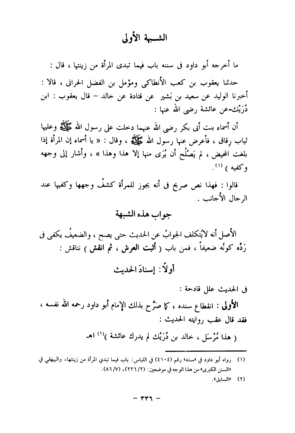 وقد أقر النبي صلى الله عليه وسلم النساء على جعل القدمين من العورة وإذا كان الأمر هكذا القدمين فكيف بما فوقهما من سائر أجزاء البدن ولا سيما الوجه الذي هو مجمع محاسن المرأة؟ وأعظم عا يَفْتَتِنُ به الرجال ويتنافسون في تحصيله إن كان حسنا.