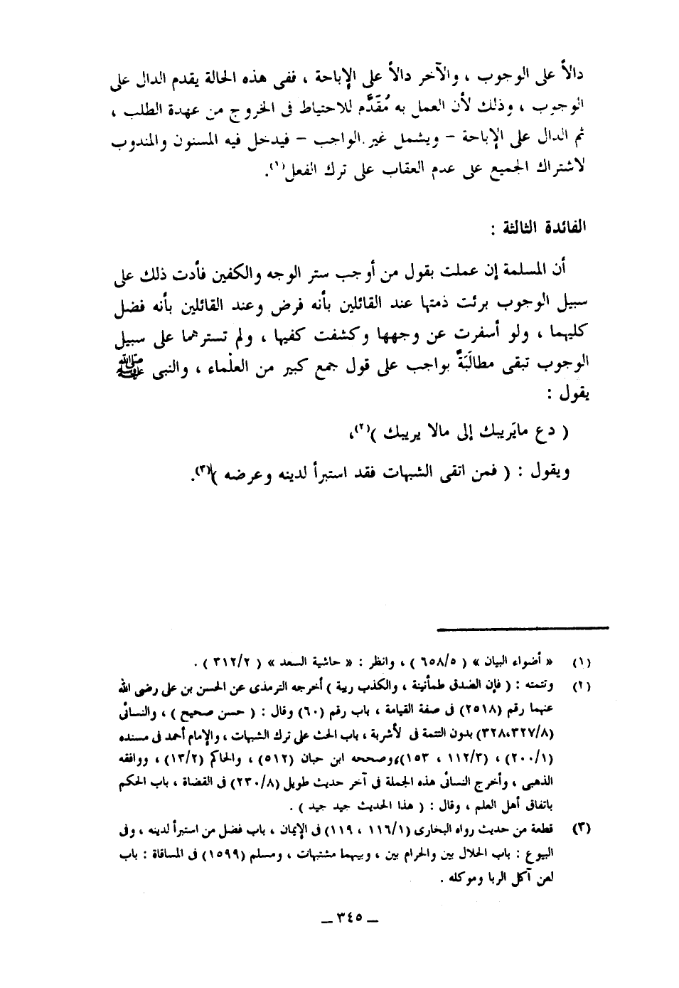 (5) رواه مسلم وغيره، وقال الدكتور البوطى: (لا يقال إن هذا قد يكون حكما خاصَا بزوجات الرسول عليه الصلاة والسلام لأن الفرق بين زوجات النبي صلى الله عليه وسلم وسائر نساء المسلمات فيما يتعلق بالحجاب، إنما هو فارق زمني فقط، ذلك أن مشروعية الحجاب تمت في حق نسائه عليه الصلاة والسلام أولا، ثم إنها عمت سائر النساء بعد حين) اهـ. من "إلى كل فتاة تؤمن بالله" ص (41-42) .
