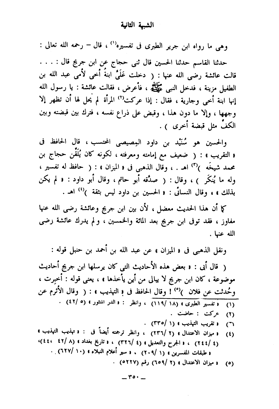 وهذان الحديثان (4) صريحان في شمول الحجاب للوجوه، بل يفيدان أن تغطية الوجوه كان هو المقصود بأمر الحجاب، والحديث الأخير حكمه عام لجميع نساء المؤمنين، فإن المراد بضمائر جمع المتكلم ليست أمهات المؤمنين فحسب كما يزعمه الزاعمون، والدليل على ذلك أن عائشة رضي الله عنها هي التي روت هذا الحديث، وهي التي كانت تفتي: بأن المرأة المحرمة تسدل جلبابها من فوق رأسها على وجهها.