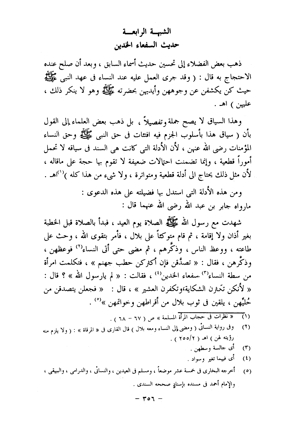 تعمد وقصد، والذين لهم إلمام بقواعد الشريعة يعرفون جيدًا أن تقييد إِباحة الشيء أو جوازه أو رخصته بحالة خاصة دليل على تحريمه في الأصل كما أن ما حرم تحريم الوسائل فإنه يباح للحاجة أو المصلحة الراجحة (انظر زاد المعاد 1/224) فجواز أو إباحة إظهار التزين - الذي يعده البعض كشف الوجه - للمخطوبة دليل على تحريم إظهار تلك الزينة في عامة الأحوال.