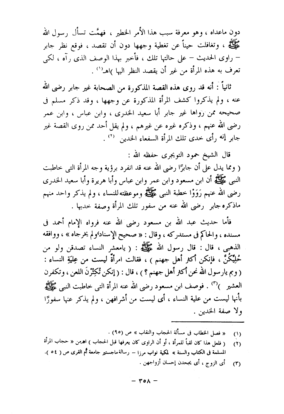 الأجنبيات ممتنع في الغالب من أجل احتجابهن عنهم، ولو كان السفور جائزًا لما كان الرجال يحتاجون أن تُنْعَتَ لهم الأجنبيات من النساء بل كانوا يستغنون بنظرهم إليهن كما هو معروف في البلدان التي قد فشا فيها