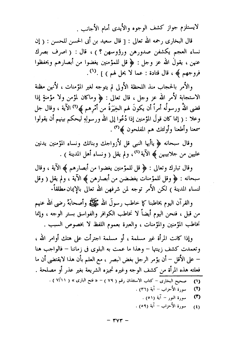 ثم قال رحمه الله تعالى ما نصه: "فإذا كُنَّ مأمورات بالجلباب وهو ستر الوجه، أو ستر الوجه بالنقاب، كان حينئذ الوجه واليدان من الزينة التي أُمِرَت ألا تظهرها للأجانب، فما بقي يَحِل للأجانب النظر إلا إلى الثياب الظاهرة، فابن مسعود ذكر آخر الأمرين، وابن عباس ذكر أول