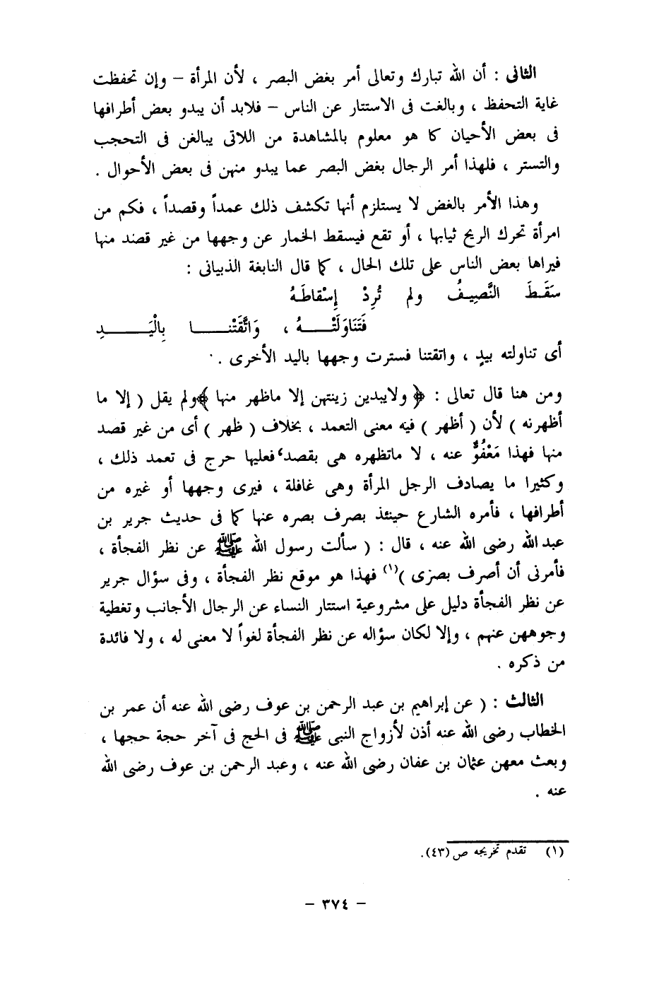 واعلم أنه هناك جملة من الأحاديث والآثار يفهم منها كشف الوجه واليدين أو اليدين فقط، وعادة العلماء الموجبين للحجاب أن يجيبوا عنها بقولهم (هذا كان قبل الأمر بالحجاب) " ومن أمثلة ذلك: