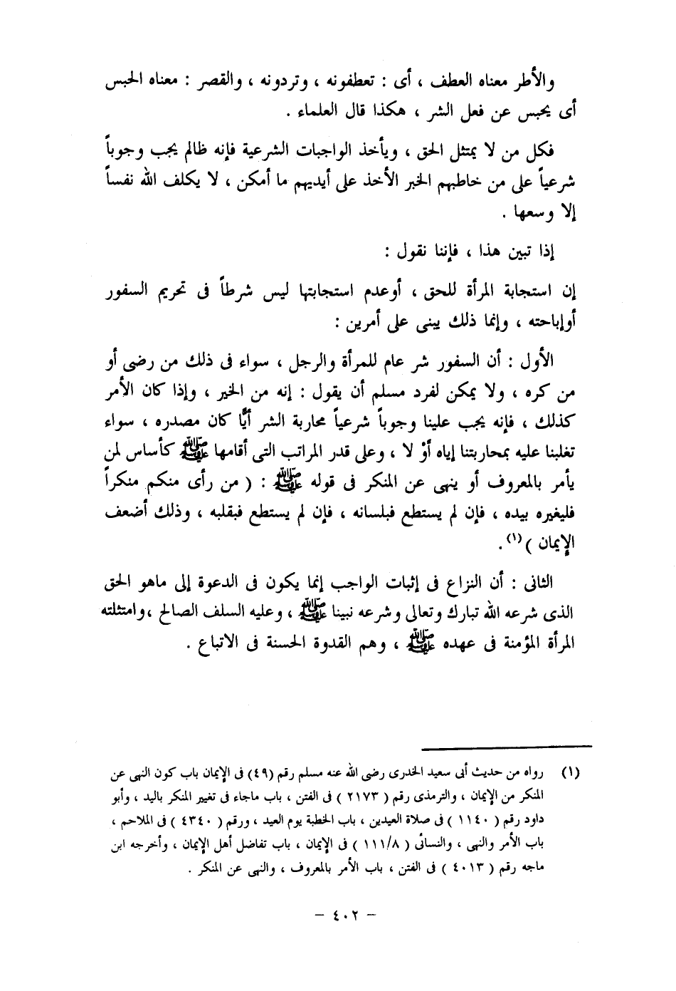 أولاَ: أن في إسناده مطيعَ بن ميمون العنبري، قال في "التقريب": لين الحديث (2) ، وقال في "التهذيب": روى عن صفية بنت عصمة. . . قال ابن عدي: له حديثان غير محفوظين، قلت: أحدهما في اختضاب النساء بالحناء" والآخر في الترجل والزينة، قال: وذكر له ثالثًا، وقال: وهما جميعا غير محفوظ " (3) اهـ.