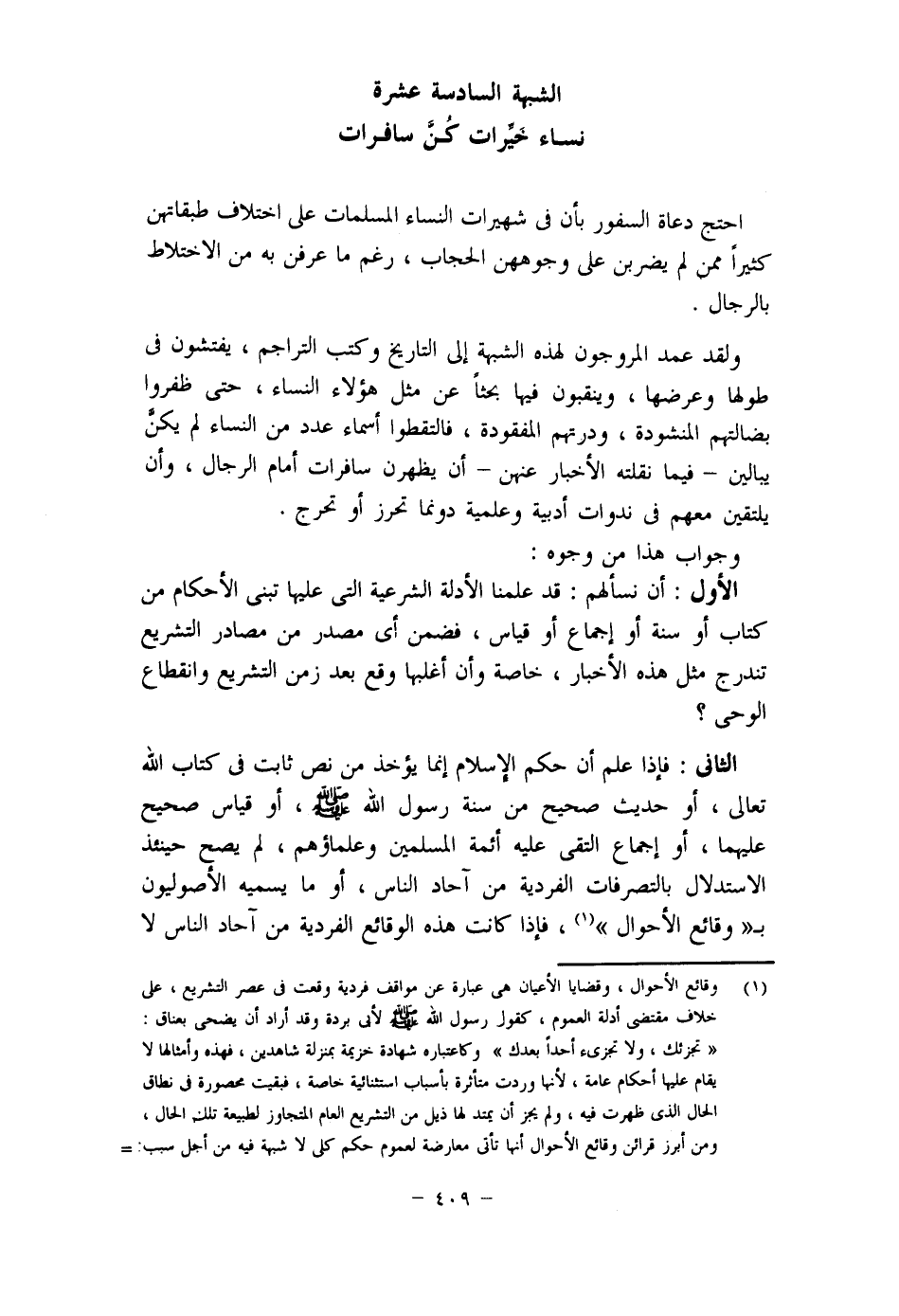رسول الله صلى الله عليه وسلم يقضي بوجوب التزامه طاعة لله عز وجل ولرسوله صلى الله عليه وسلم، أما كونه يقضي بأن هناك شيئًا مكشوفا للأجانب من المرأة المسلمة هو الوجه والكفان، فهذا قول غير صحيح يرده النقل والعقل، ويأباه الواقع، وبيان ذلك من وجوه: