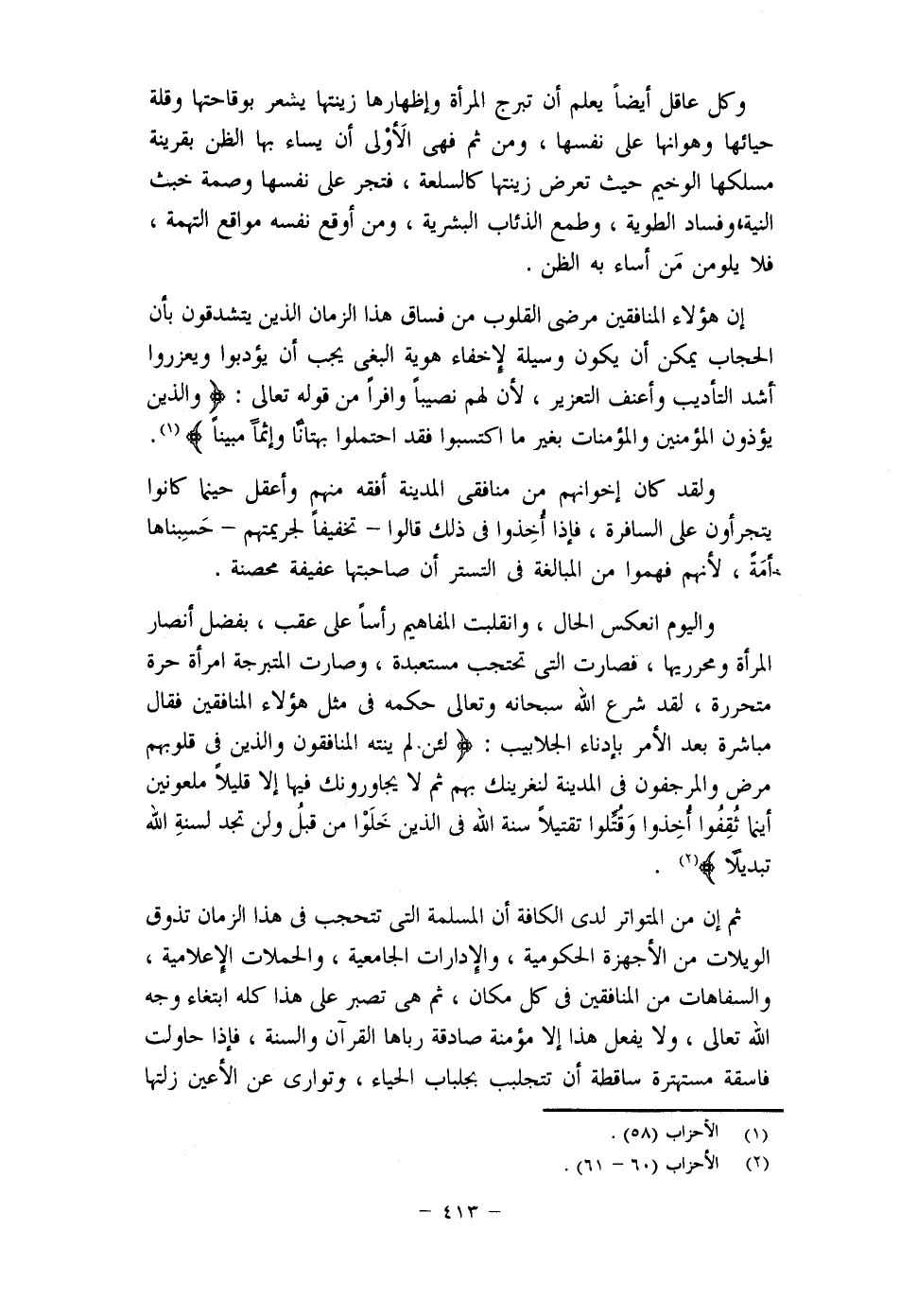 وقوله جل وعلا: (يَا أَيُّهَا النَّبِيُّ قُلْ لِأَزْوَاجِكَ وَبَنَاتِكَ وَنِسَاءِ الْمُؤْمِنِينَ يُدْنِينَ عَلَيْهِنَّ مِنْ جَلَابِيبِهِنَّ ذَلِكَ أَدْنَى أَنْ يُعْرَفْنَ فَلَا يُؤْذَيْنَ وَكَانَ اللَّهُ غَفُورًا رَحِيمًا (59)) [الأحزاب: 59] ، كل هذه الأوامر بالحجاب إنما نزلت في