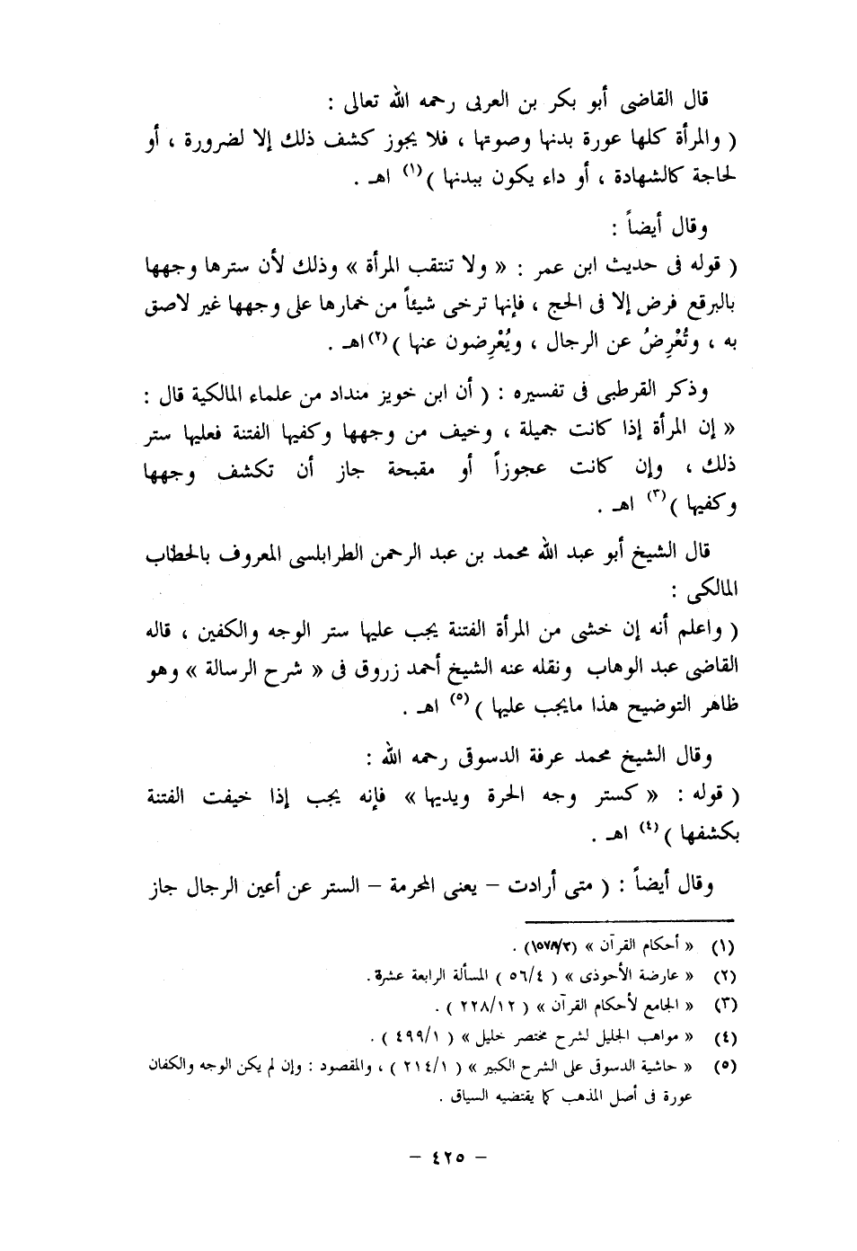 303 - 306) من أن المرأة لا تمنع من تغطية الوجه والكفين، وأن الذي تمنع منه
