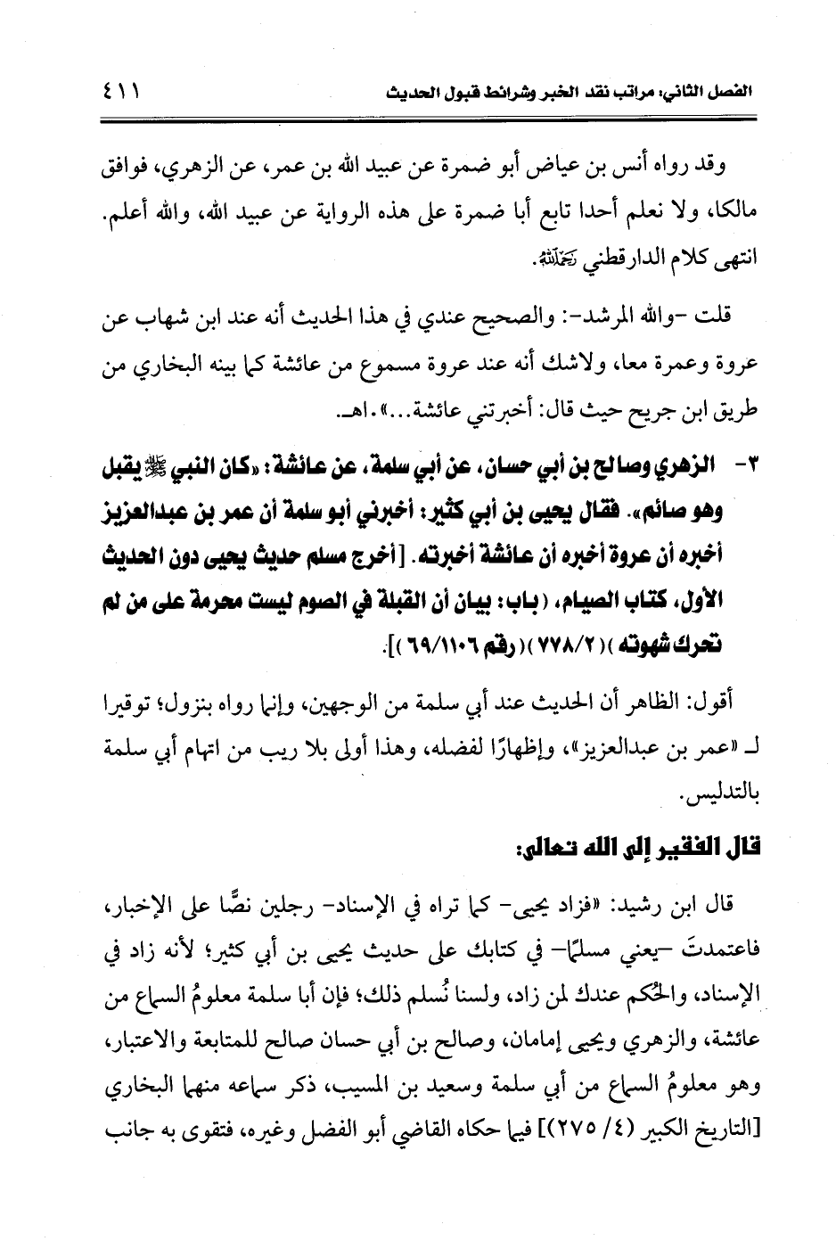 قال ابن رشيد: "فزاد يحيى -كما تراه في الإسناد- رجلين نصًّا على الإخبار، فاعتمدتَ -يعني مسلمًا- في كتابك على حديث يحيى بن أبي كثير؛ لأنه زاد في الإسناد، والحُكم عندك لمن زاد، ولسنا نُسلم ذلك؛ فإن أبا سلمة معلومُ السماع من عائشة، والزهري ويحيى إمامان، وصالح بن أبي حسان صالح للمتابعة والاعتبار، وهو معلومُ السماع من أبي سلمة وسعيد بن المسيب، ذكر سماعه منهما البخاري [التاريخ الكبير (4/ 275)] فيما حكاه القاضي أبو الفضل وغيره، فتقوى به جانب