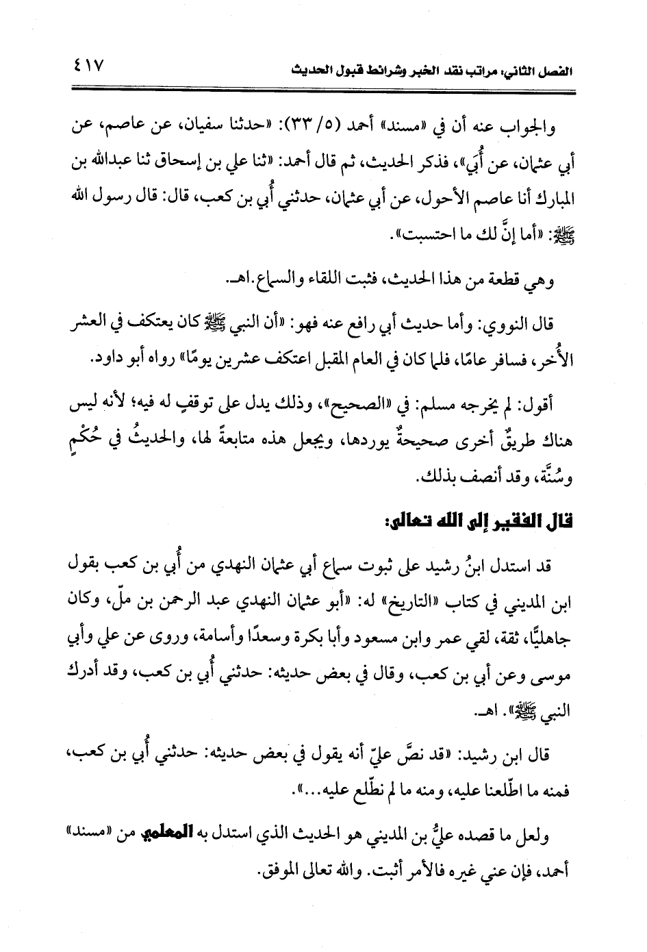 قد استدل ابنُ رشيد على ثبوت سماع أبي عثمان النهدي من أُبي بن كعب يقول ابن المديني في كتاب "التاريخ" له: "أبو عثمان النهدي عبد الرحمن بن ملّ، وكان جاهليًّا، ثقة، لقي عمر وابن مسعود وأبا بكرة وسعدًا وأسامة، وروى عن علي وأبي موسى وعن أبي بن كعب، وقال في بعض حديثه: حدثني أُبي بن كعب، وقد أدرك النبي -صلى الله عليه وسلم-". اهـ.