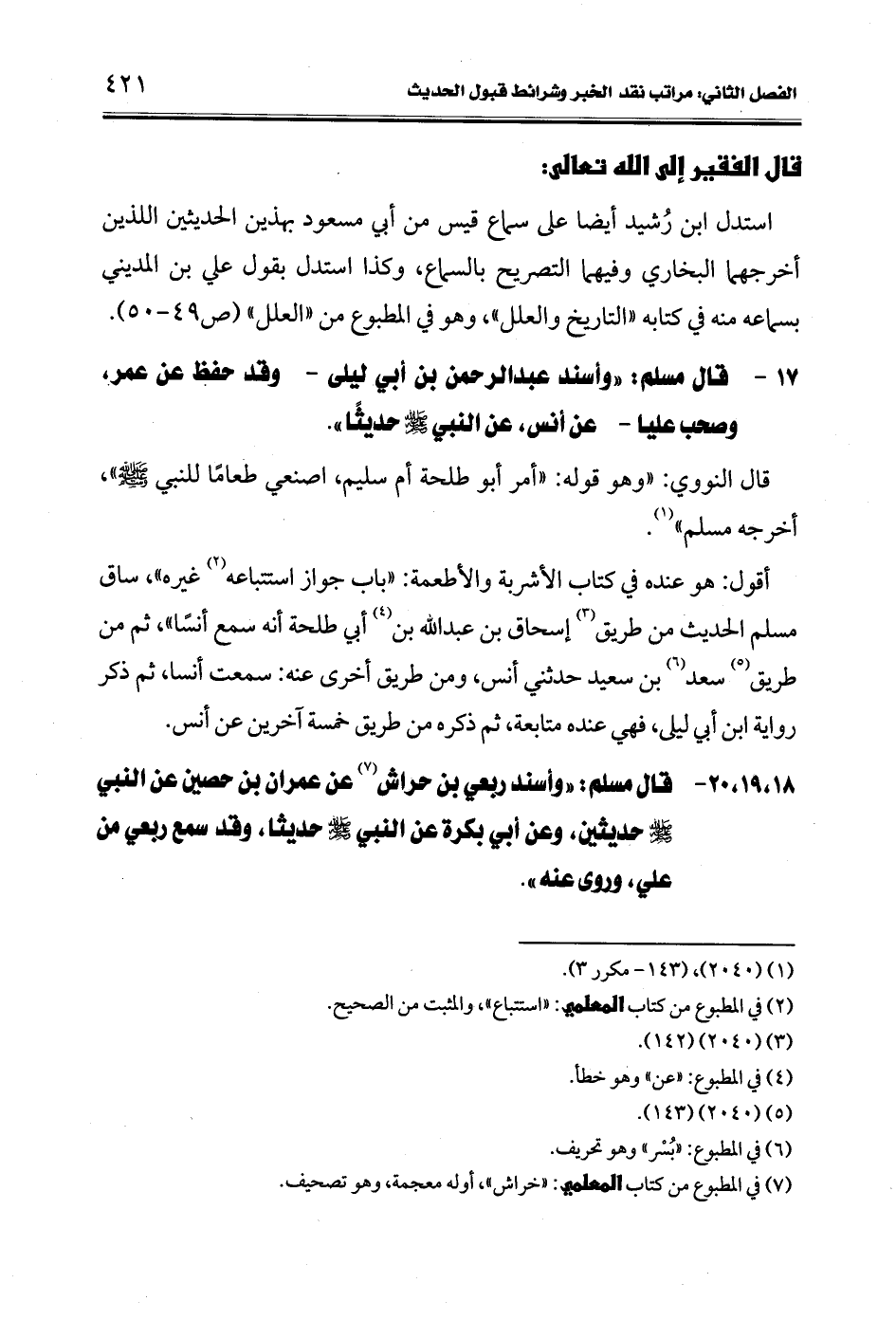 18، 19، 20 - قال مسلم: "وأسند ربعي بن حراش (¬7) عن عمران بن حصين عن النبي -صلى الله عليه وسلم- حديثين، وعن أبي بكرة عن النبي -صلى الله عليه وسلم- حديثا، وقد سمع ربعي من علي، وروى عنه".