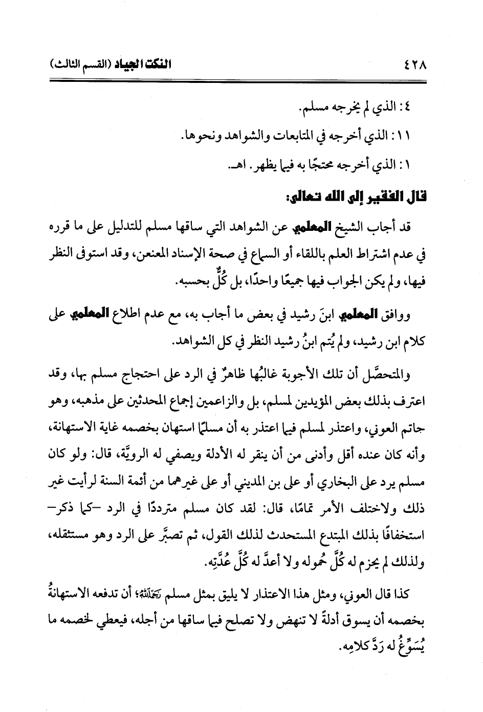 كذا قال العوني، ومثل هذا الاعتذار لا يليق بمثل مسلم رحمه الله، أن تدفعه الاستهانةُ بخصمه أن يسوق أدلةً لا تنهض ولا تصلح فيما ساقها من أجله فيعطي لخصمه ما يُسَوِّغُ له ردَّ كلامِه.