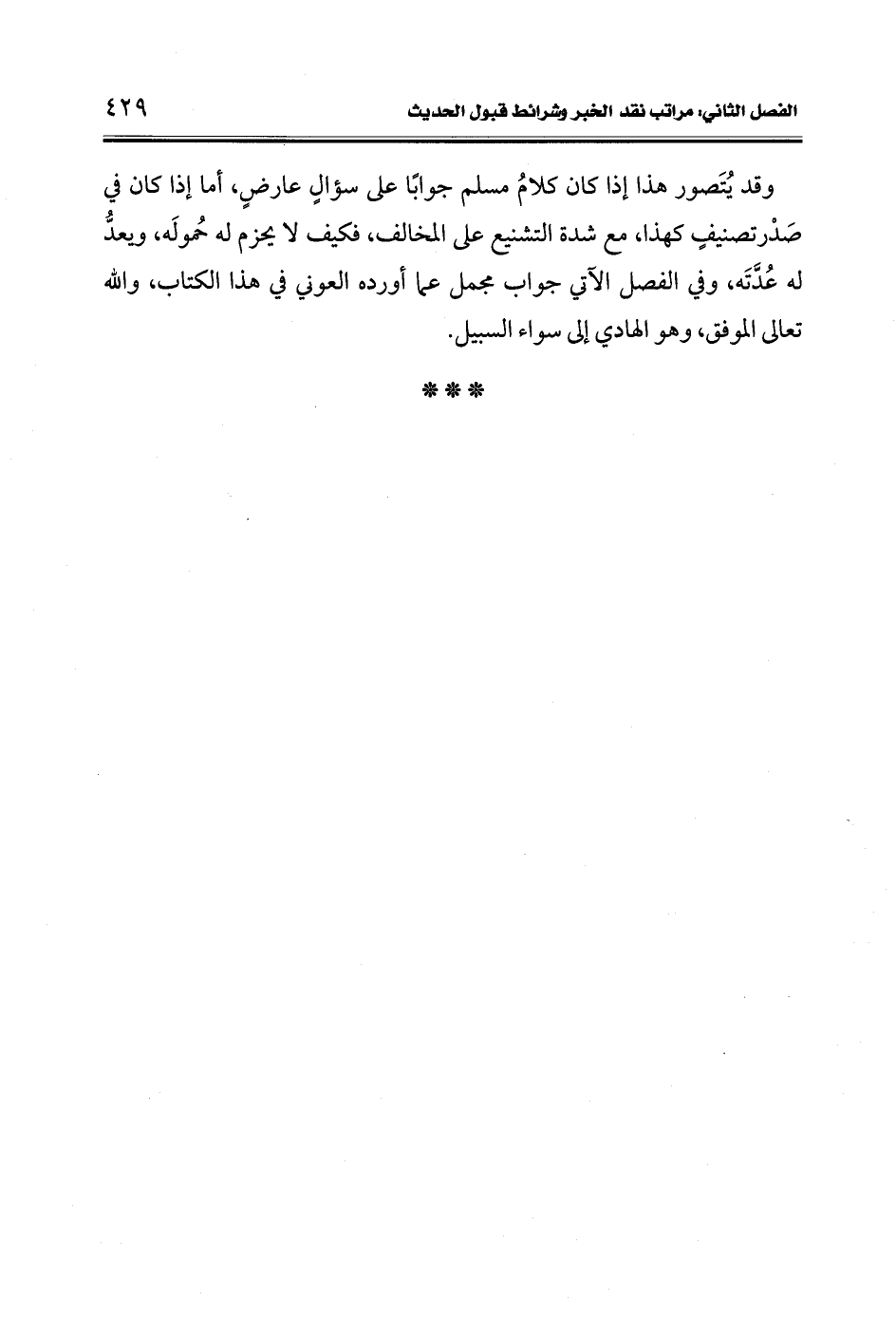 وقد يُتَصور هذا إذا كان كلامُ مسلم جوابًا على سؤالٍ عارضٍ، أما إذا كان في صَدر تصنيفٍ كهذا، مع شدة التشنيع على المخالف، فكيف لا يحزم له حُمولَه، ويعدُّ له عُدَّتَه، وفي الفصل الآتي جواب مجمل عما أورده العوني في هذا الكتاب، والله تعالى الموفق، وهو الهادي إلى سواء السبيل.