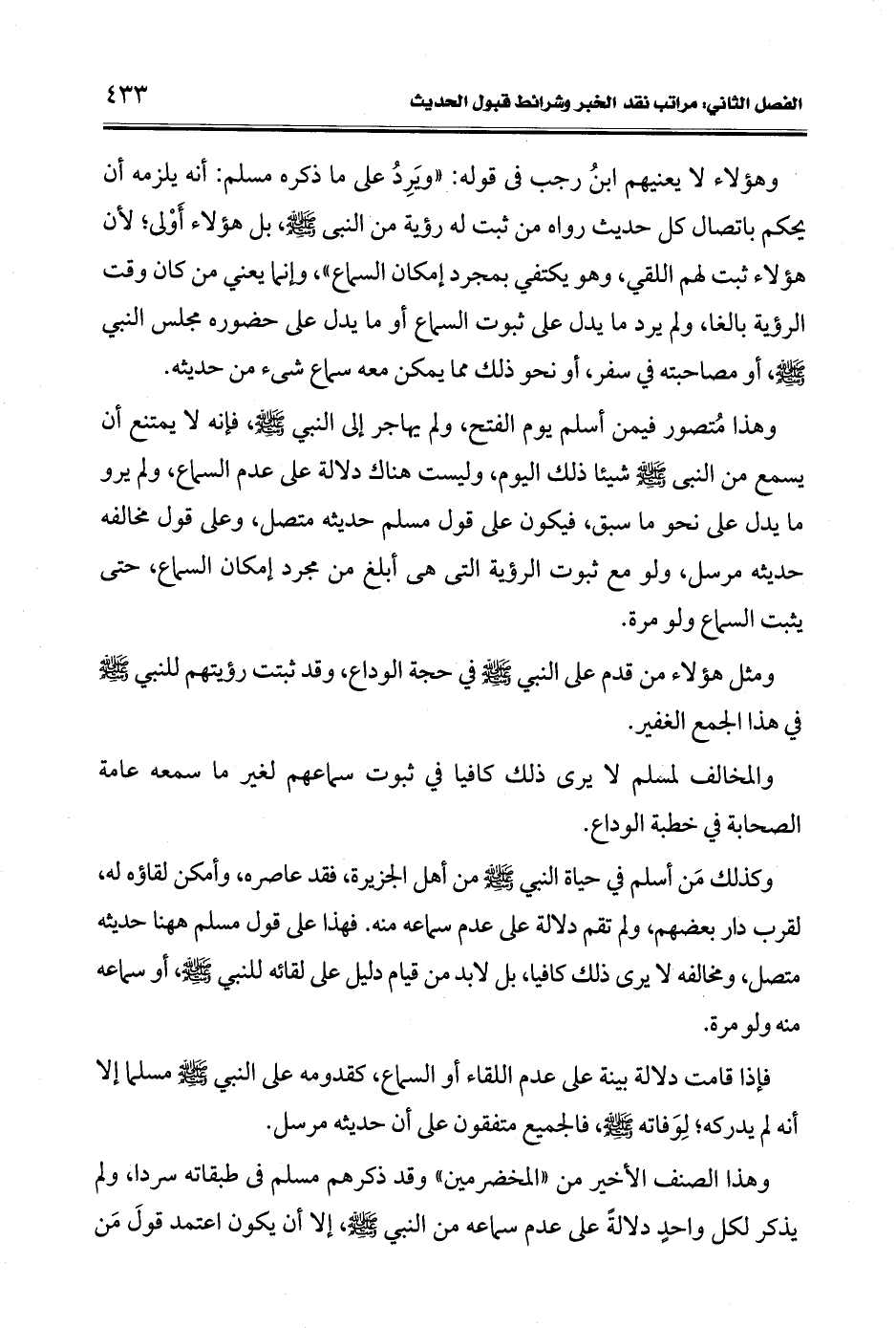 وهؤلاء لا يعنيهم ابنُ رجب فى قوله: "ويَرِدُ على ما ذكره مسلم: أنه يلزمه أن يحكم باتصال كل حديث رواه من ثبت له رؤية من النبى -صلى الله عليه وسلم-، بل هؤلاء أَوْلى؛ لأن هؤلاء ثبت لهم اللقي، وهو يكتفي بمجرد إمكان السماع"، وإنما يعني من كان وقت الرؤية بالغا، ولم يرد ما يدل على ثبوت السماع أو ما يدل على حضوره مجلس النبي -صلى الله عليه وسلم-، أو مصاحبته في سفر، أو نحو ذلك مما يمكن معه سماع شيء من حديثه.