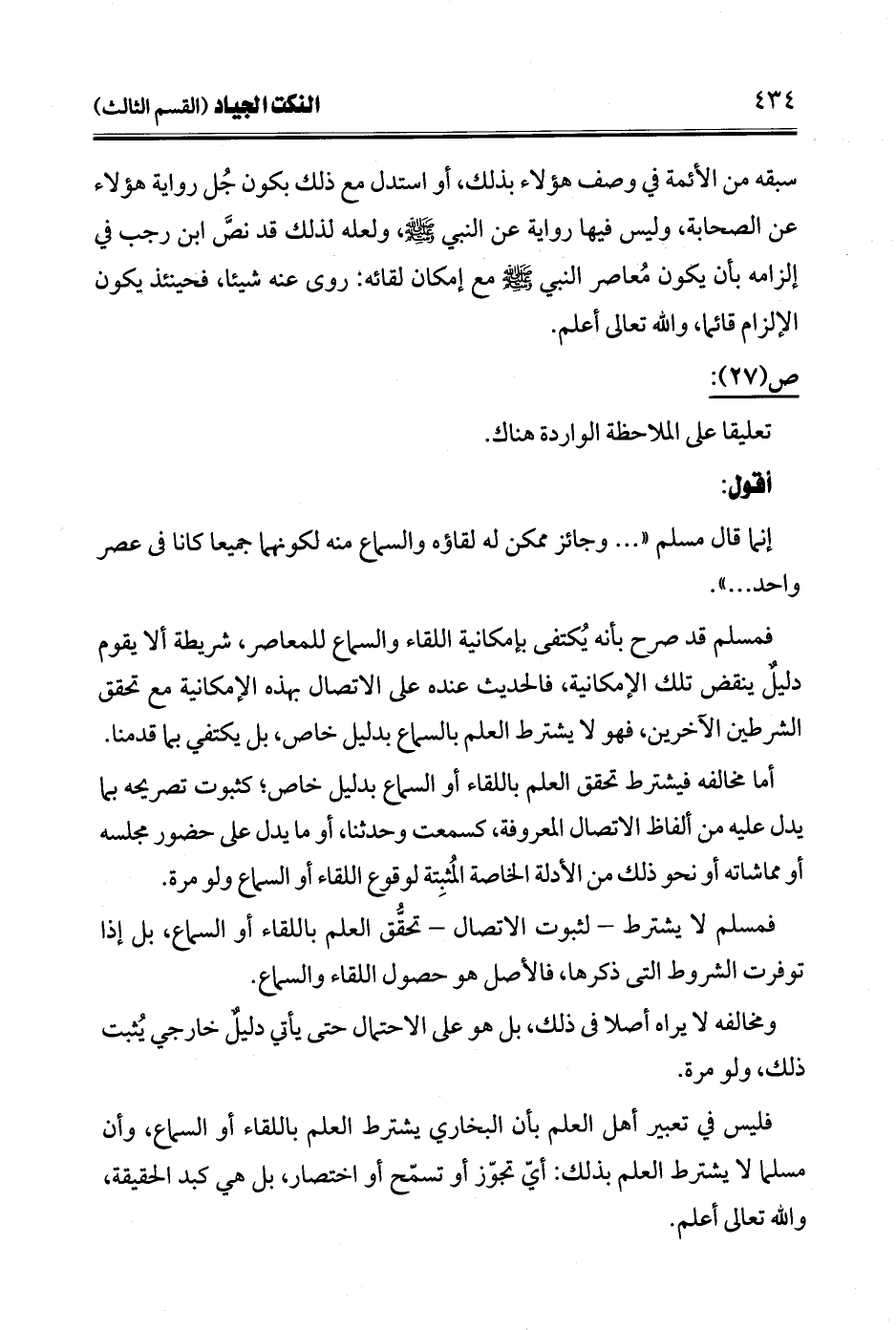 فمسلم لا يشترط -لثبوت الاتصال- تحقُّق العلم باللقاء أو السماع، بل إذا توفرت الشروط التى ذكرها، فالأصل هو حصول اللقاء والسماع.