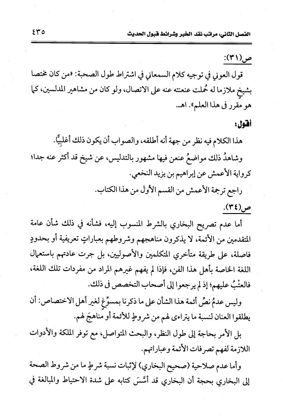 قول العوني في توجيه كلام السمعاني في اشتراط طول الصحبة: "من كان مختصا بشيخٍ ملازما له حُملت عنعنته عنه على الاتصال، ولو كان من مشاهير المدلسين، كما هو مقرر فى هذا العلم". اهـ.