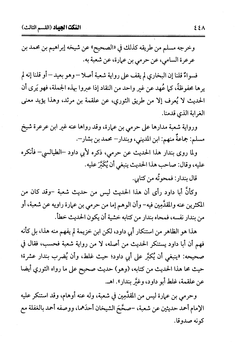 ورواية شعبة مدارها على حرمي بن عمارة، وقد رواها عنه غير ابن عرعرة شيخ مسلم: جماعةٌ منهم: ابن المديني، وبندار -محمد بن بشار-.