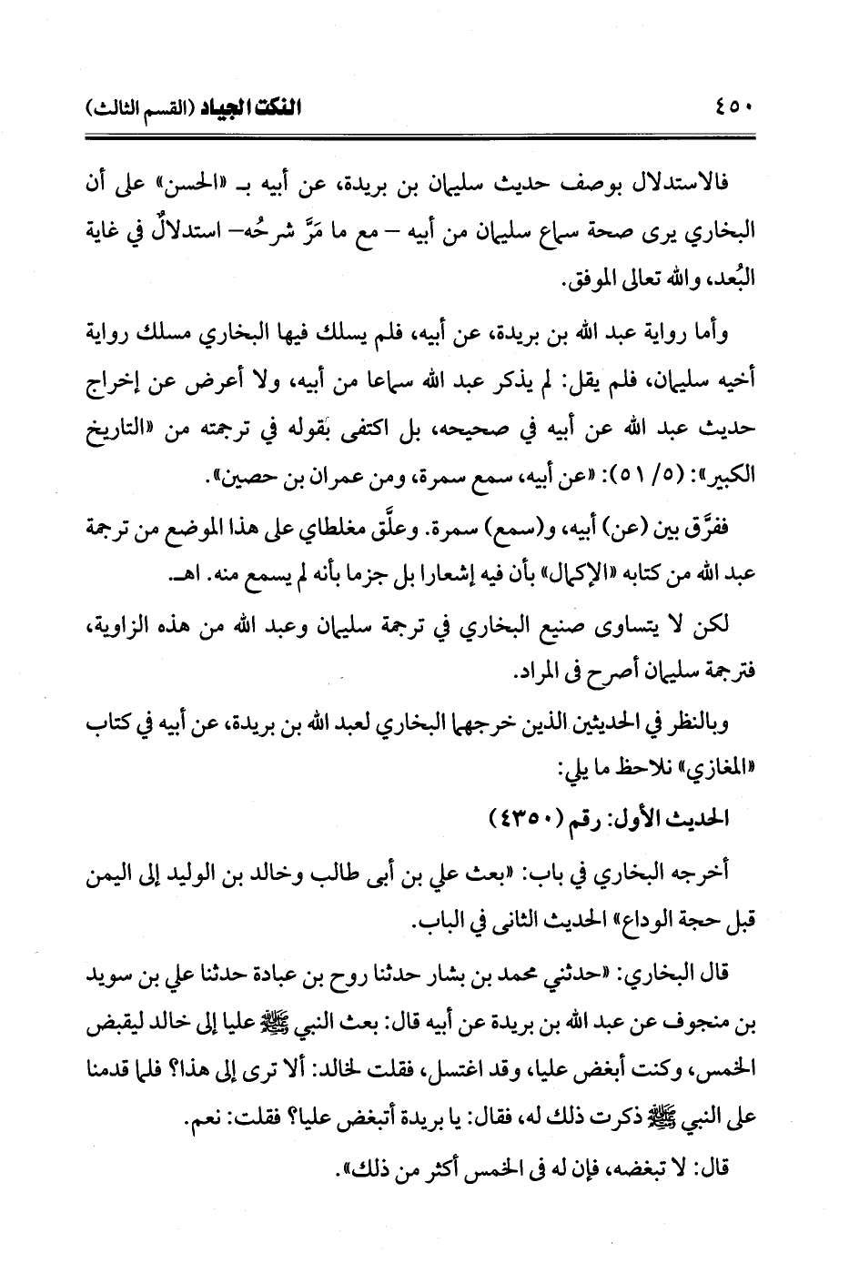 قال البخاري: "حدثني محمد بن بشار حدثنا روح بن عبادة حدثنا علي بن سويد بن منجوف عن عبد الله بن بريدة عن أبيه قال: بعث النبي -صلى الله عليه وسلم- عليا إلى خالد ليقبض الخمس، وكنت أبغض عليا، وقد اغتسل، فقلت لخالد: ألا ترى إلى هذا؟ فلما قدمنا على النبي -صلى الله عليه وسلم- ذكرت ذلك له، فقال: يا بريدة أتبغض عليا؟ فقلت: نعم.