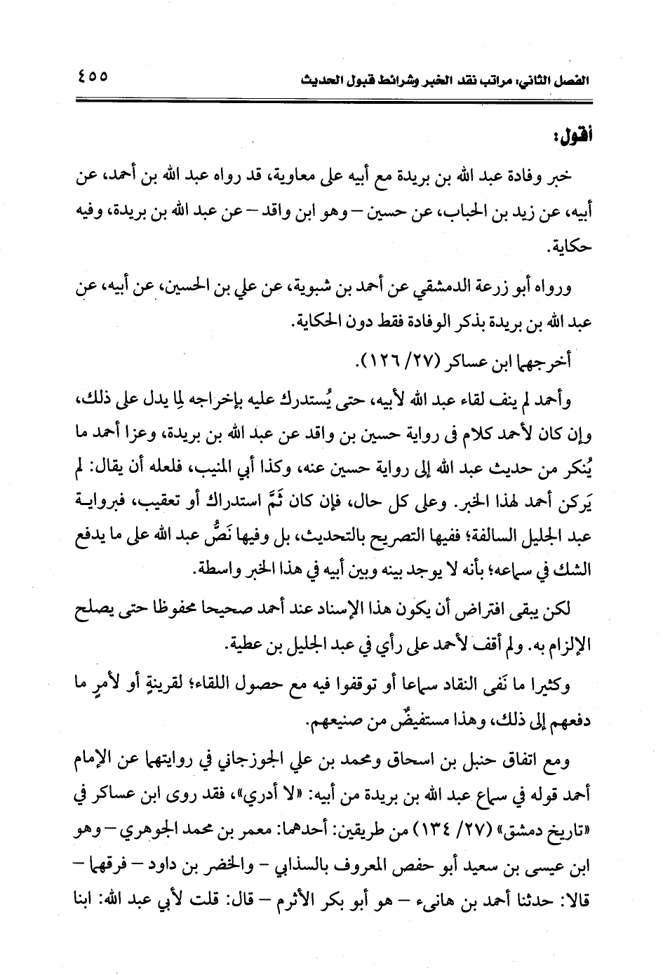وأحمد لم ينف لقاء عبد الله لأبيه حتى يُستدرك عليه لإخراجه لما يدل على ذلك، وإن كان لأحمد كلام فى رواية حسين بن واقد عن عبد الله بن بريدة، وعزا أحمد ما يُنكر من حديث عبد الله إلى رواية حسين عنه، وكذا أبي المنيب، فلعله أن يقال: لم يَركن أحمد لهذا الخبر. وعلى كل حال، فإن كان ثَمَّ استدراك أو تعقيب، فبرواية عبد الجليل السالفة؛ ففيها التصريح بالتحديث، بل وفيها نَصُّ عبد الله على ما يدفع الشك في سماعه؛ بأنه لا يوجد بينه وبين أبيه في هذا الخبر واسطة.
