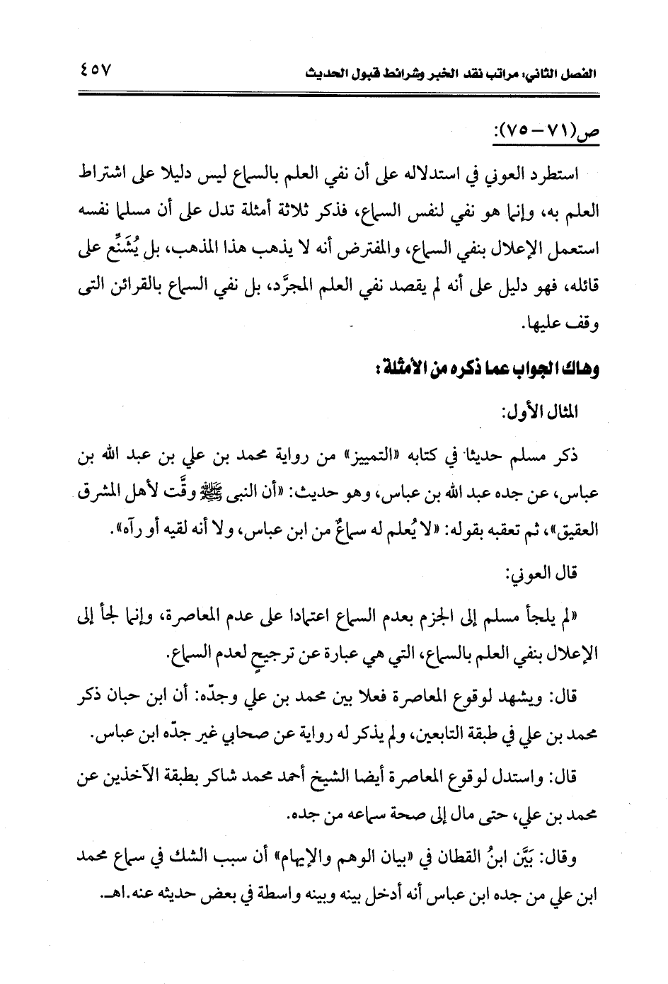 استطرد العوني في استدلاله على أن نفي العلم بالسماع ليس دليلا على اشتراط العلم به، وإنما هو نفي لنفس السماع، فذكر ثلاثة أمثلة تدل على أن مسلما نفسه استعمل الإعلال بنفي السماع، والمفترض أنه لا يذهب هذا المذهب، بل يُشَنِّع على قائله، فهو دليل على أنه لم يقصد نفي العلم المجرَّد، بل نفي السماع بالقرائن التى وقف عليها.