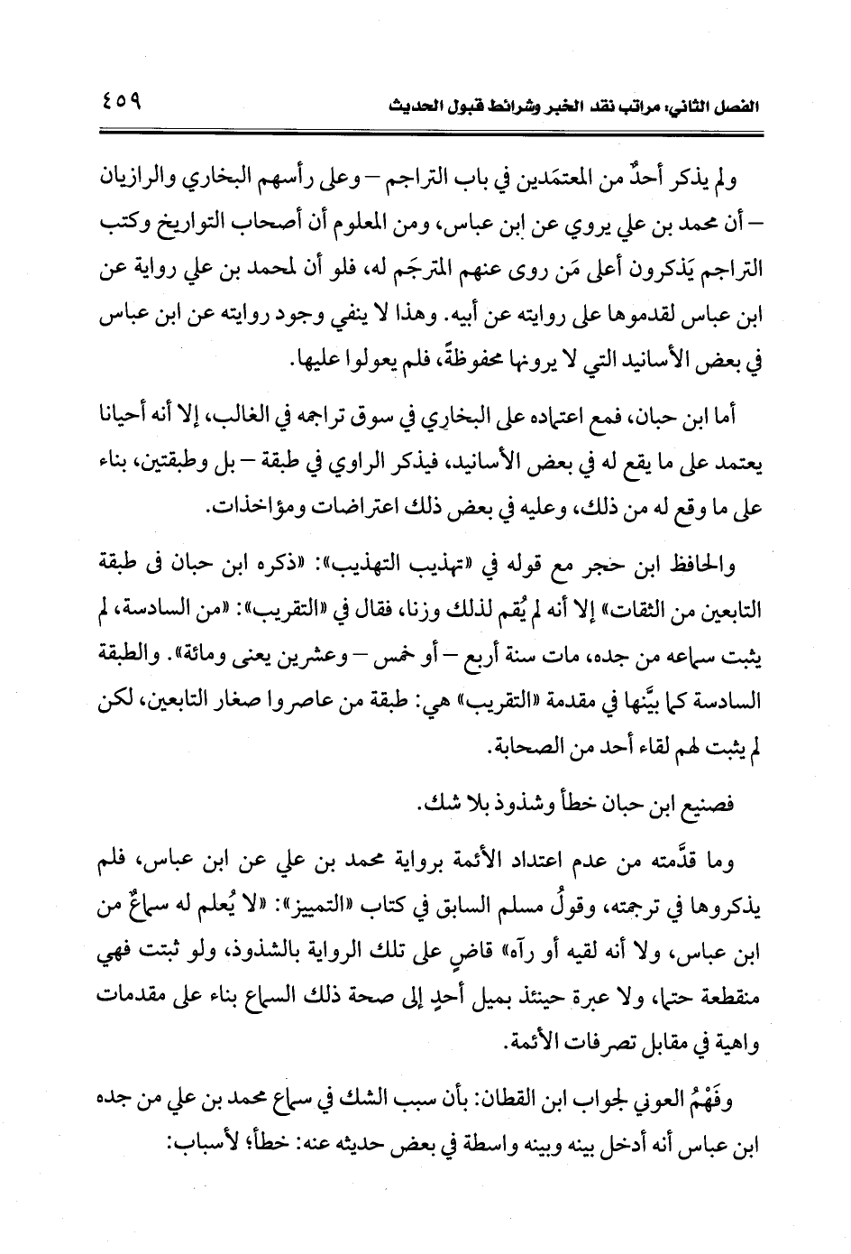 وما قدَّمته من عدم اعتداد الأئمة برواية محمد بن علي عن ابن عباس، فلم يذكروها في ترجمته، وقولُ مسلم السابق في كتاب "التمييز": "لا يُعلم له سماعٌ من ابن عباس، ولا أنه لقيه أو رآه" قاضٍ على تلك الرواية بالشذوذ، ولو ثبتت فهي منقطعة حتما، ولا عبرة حينئذ بميل أحدٍ إلى صحة ذلك السماع بناء على مقدمات واهية في مقابل تصرفات الأئمة.