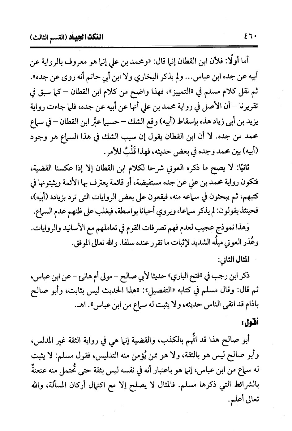 ثانيًا: لا يصح ما ذكره العوني شرحا لكلام ابن القطان إلا إذا عكسنا القضية، فتكون رواية محمد بن علي عن جده مستفيضة، أو قائمة يعترف بها الأئمة ويثبتونها في كتبهم، ثم يبحثون في سماعه منه، فيقعون على بعض الروايات التى ترد بزيادة (أبيه)، فحينئذ يقولون: لم يذكر سماعا، ويروي أحيانا بواسطة، فيغلب على ظنهم عدم السماع.