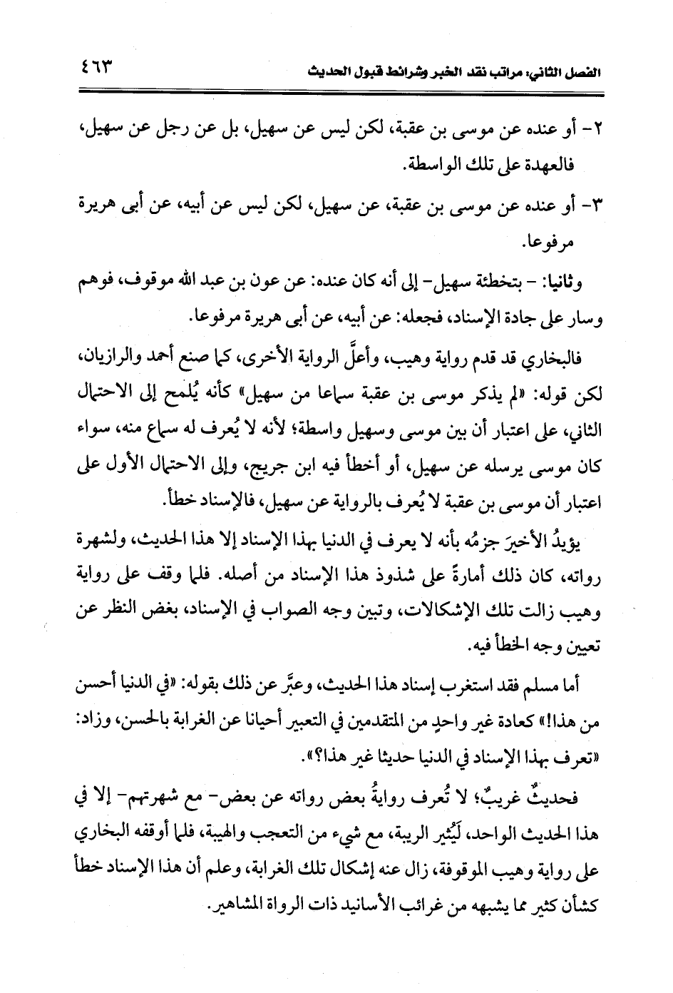 يؤيدُ الأخيرَ جزمُه بأنه لا يعرف في الدنيا بهذا الإسناد إلا هذا الحديث، ولشهرة رواته، كان ذلك أمارةً على شذوذ هذا الإسناد من أصله. فلما وقف على رواية وهيب زالت تلك الإشكالات، وتبين وجه الصواب في الإسناد، بغض النظر عن تعيين وجه الخطأ فيه.