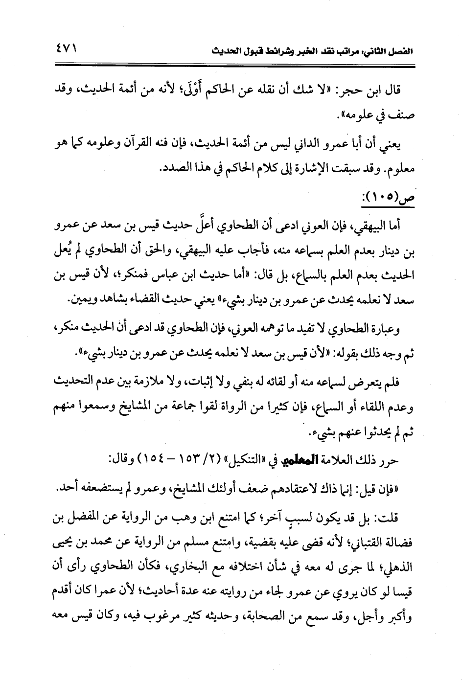 قلت: بل قد يكون لسببٍ آخر؛ كما امتنع ابن وهب من الرواية عن المفضل بن فضالة القتباني؛ لأنه قضى عليه بقضية، وامتنع مسلم من الرواية عن محمد بن يحيى الذهلي؛ لما جرى له معه في شأن اختلافه مع البخاري، فكأن الطحاوي رأى أن قيسا لو كان يروي عن عمرو لجاء من روايته عنه عدة أحاديث؛ لأن عمرا كان أقدم وأكبر وأجل، وقد سمع من الصحابة، وحديثه كثير مرغوب فيه، وكان قيس معه