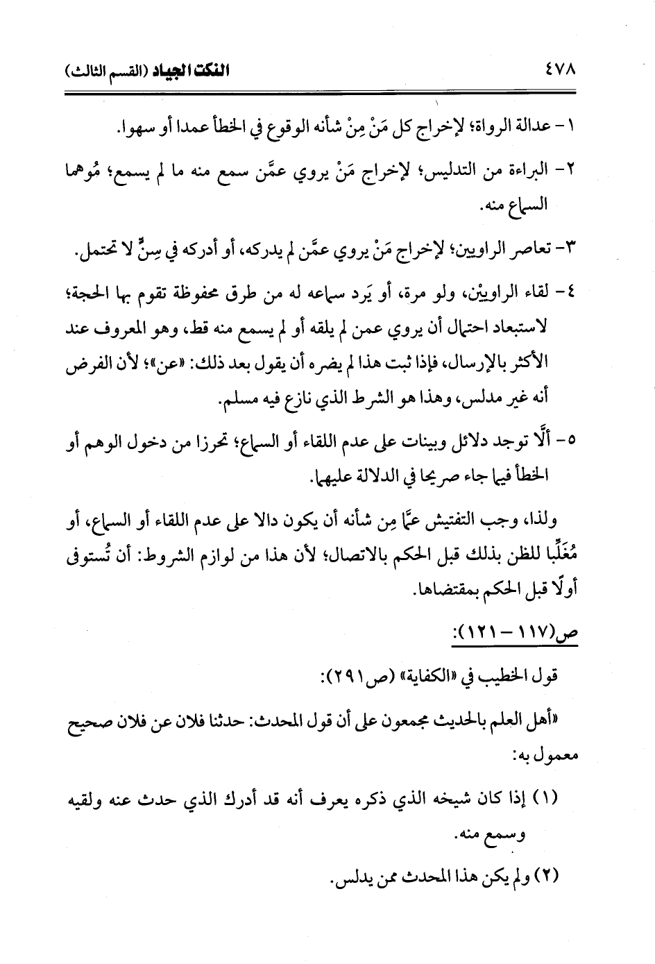 4 - لقاء الراوييْن، ولو مرة، أو يَرد سماعه له من طرق محفوظة تقوم بها الحجة؛ لاستبعاد احتمال أن يروي عمن لم يلقه أو لم يسمع منه قط، وهو المعروف عند الأكثر بالإرسال، فإذا ثبت هذا لم يضره أن يقول بعد ذلك: "عن"؛ لأن الفرض أنه غير مدلس، وهذا هو الشرط الذي نازع فيه مسلم.