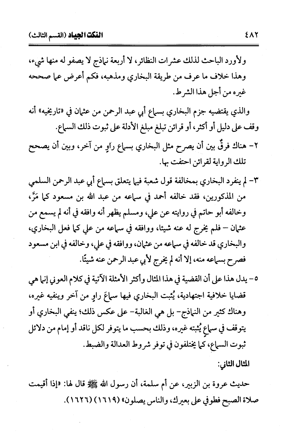 4 - يدل هذا على أن القضية في هذا المثال وأكثر الأمثلة الآتية في كلام العوني إنما هي قضايا خلافية اجتهادية، يُثبت البخاري فيها سماعَ راوٍ من آخر وينفيه غيره، وهناك كثير من النماذج -بل هي الغالبة- على عكس ذلك؛ ينفي البخاري أو يتوقف في سماعٍ يُثبته غيره، وذلك بحسب ما يتوفر لكل ناقد أو إمام من دلائل ثبوت السماع، كما يختلفون في توفر شروط العدالة والضبط.