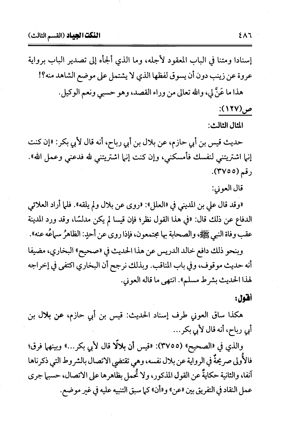 "وقد قال علي بن المديني في "العلل": "روى عن بلال ولم يلقه". فلما أراد العلائي الدفاع عن ذلك قال: "في هذا القول نظر؛ فإن قيسا لم يكن مدلسًا، وقد ورد المدينة عقب وفاة النبي -صلى الله عليه وسلم-، والصحابة بها مجتمعون، فإذا روى عن أحدٍ: الظاهرُ سماعُه عنه".