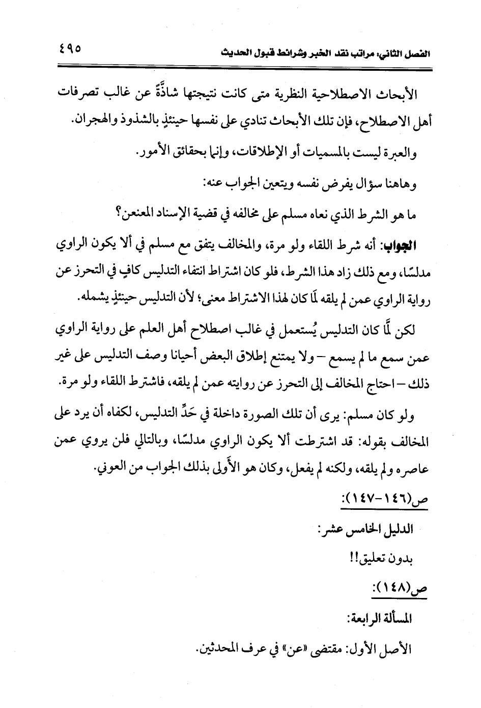 ولو كان مسلم: يرى أن تلك الصورة داخلة في حَدِّ التدليس، لكفاه أن يرد على المخالف بقوله: قد اشترطت ألا يكون الراوي مدلسًا، وبالتالي فلن يروي عمن عاصره ولم يلقه، ولكنه لم يفعل، وكان هو الأَولى بذلك الجواب من العوني.