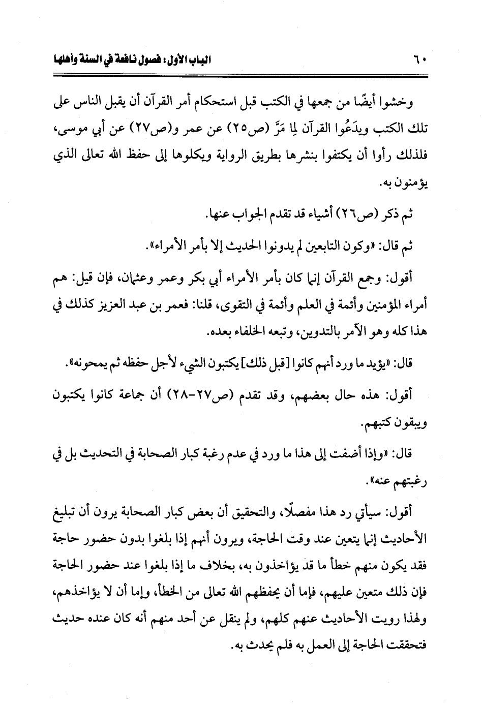 وخشوا أيضًا من جمعها في الكتب قبل استحكام أمر القرآن أن يقبل الناس على تلك الكتب ويدَعُوا القرآن لما مَرَّ (ص 25) عن عمر و (ص 27) عن أبي موسى، فلذلك رأوا أن يكتفوا بنشرها بطريق الرواية ويأكلوها إلى حفظ الله تعالى الذي يؤمنون به.