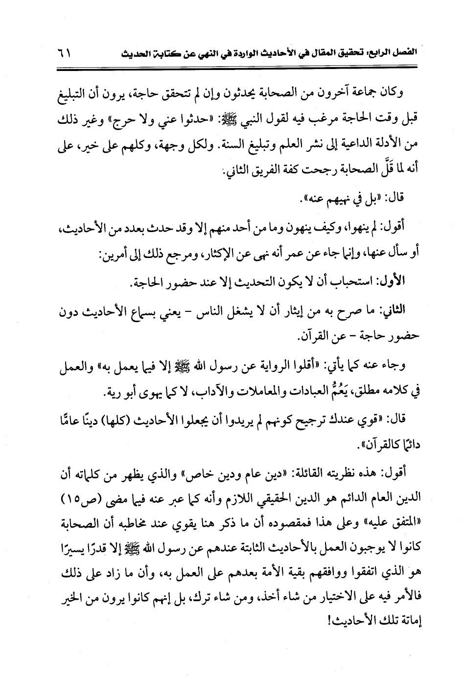 أقول: هذه نظريته القائلة: "دين عام ودين خاص" والذي يظهر من كلماته أن الدين العام الدائم هو الدين الحقيقي اللازم وأنه كما عبر عنه فيما مضى (ص 15) "المتفق عليه" وعلى هذا فمقصوده أن ما ذكر هنا يقوي عند مخاطبه أن الصحابة كانوا لا يوجبون العمل بالأحاديث الثابتة عندهم عن رسول الله -صلى الله عليه وسلم- إلا قدرًا يسيرًا هو الذي اتفقوا ووافقهم بقية الأمة بعدهم على العمل به، وأن ما زاد على ذلك فالأمر فيه على الاختيار من شاء أخذ، ومن شاء ترك، بل إنهم كانوا يرون من الخير إماتة تلك الأحاديث!