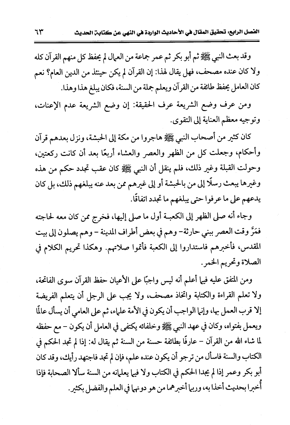 كان كثير من أصحاب النبي -صلى الله عليه وسلم- هاجروا من مكة إلى الحبشة، ونزل بعدهم قرآن وأحكام، وجعلت كل من الظهر والعصر والعشاء أربعًا بعد أن كانت ركعتين، وحولت القبلة وغير ذلك، فلم ينقل أن النبي -صلى الله عليه وسلم- كان عقب تجدد حكم من هذه وغيرها يبعث رسلًا إلى من بالحبشة أو إلى غيرهم ممن بعد عنه يبلغهم ذلك، بل كان يدعهم على ما عرفوا حتى يبلغهم ما تجدد اتفاقًا.