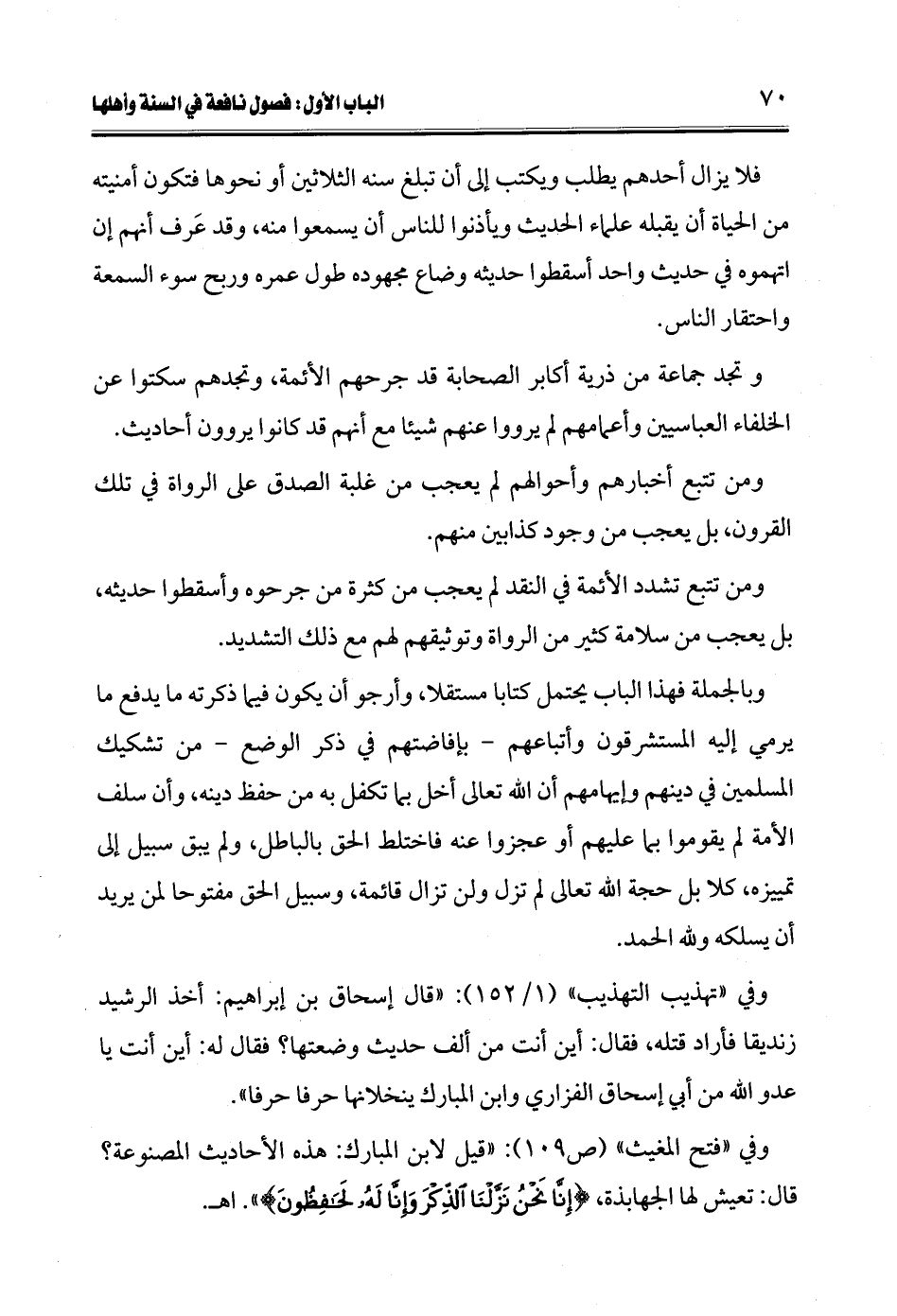 وبالجملة فهذا الباب يحتمل كتابًا مستقلًا، وأرجو أن يكون فيما ذكرته ما يدفع ما يرمي إليه المستشرقون وأتباعهم -بإفاضتهم في ذكر الوضع- من تشكيك المسلمين في دينهم وإيهامهم أن الله تعالى أحل بما تكفل به من حفظ دينه، وأن سلف الأمة لم يقوموا بما عليهم أو عجزوا عنه فاختلط الحق بالباطل، ولم يبق سبيل إلى تمييزه، كلا بل حجة الله تعالى لم تزل ولن تزال قائمة، وسبيل الحق مفتوحا لمن يريد أن يسلكه ولله الحمد.