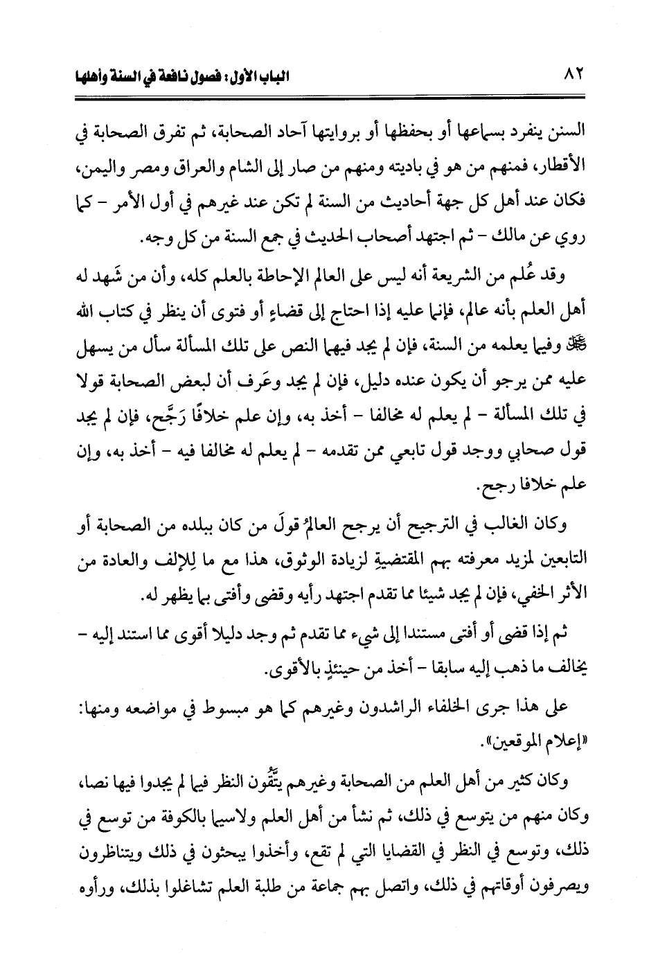 وقد عُلم من الشريعة أنه ليس على العالم الإحاطة بالعلم كله، وأن من شَهد له أهل العلم بأنه عالم، فإنما عليه إذا احتاج إلى قضاءٍ أو فتوى أن ينظر في كتاب الله عز وجل وفيما يعلمه من السنة، فإن لم يجد فيهما النص على تلك المسألة سأل من يسهل عليه ممن يرجو أن يكون عنده دليل، فإن لم يجد وعَرف أن لبعض الصحابة قولًا في تلك المسألة -لم يعلم له مخالفا- أخذ به، وإن علم خلافًا رَجَّح، فإن لم يجد قول صحابي ووجد قول تابعي ممن تقدمه -لم يعلم له مخالفا فيه- أخذ به، وإن علم خلافا رجح.